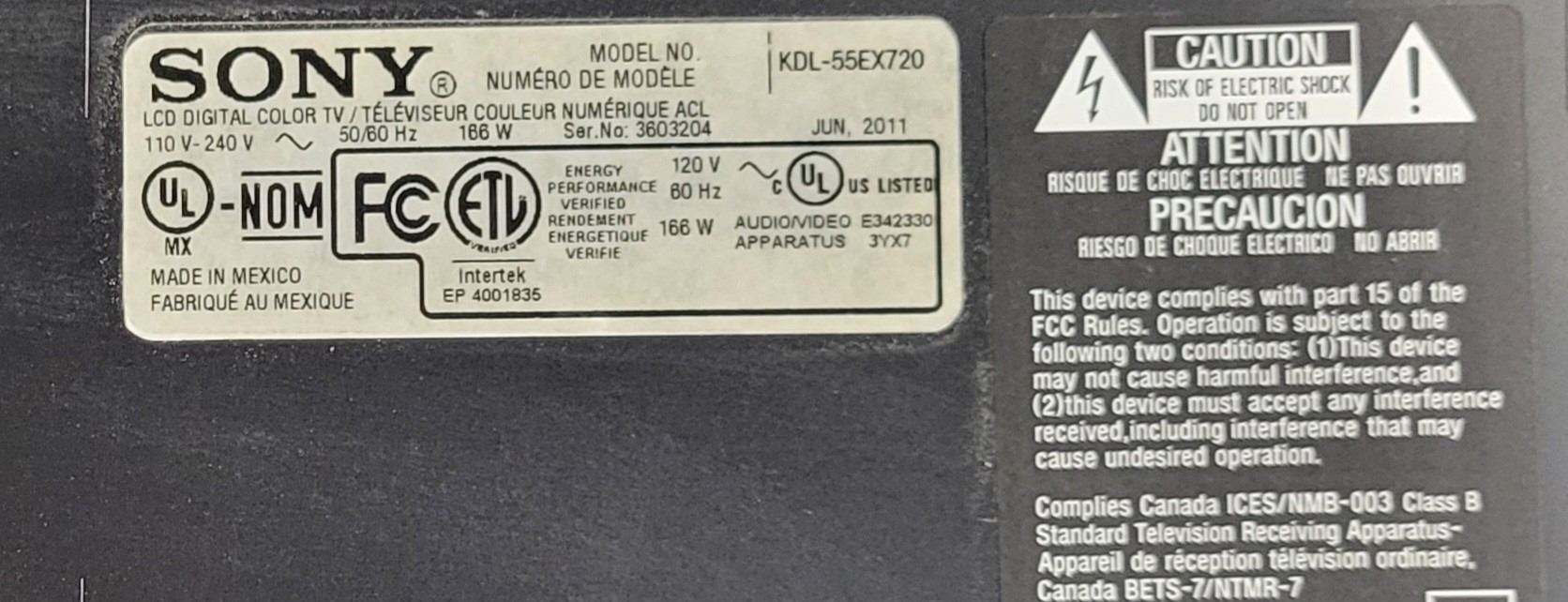 2011 Sony 55" Flat Screen TV w/ remote, in good working condition...used