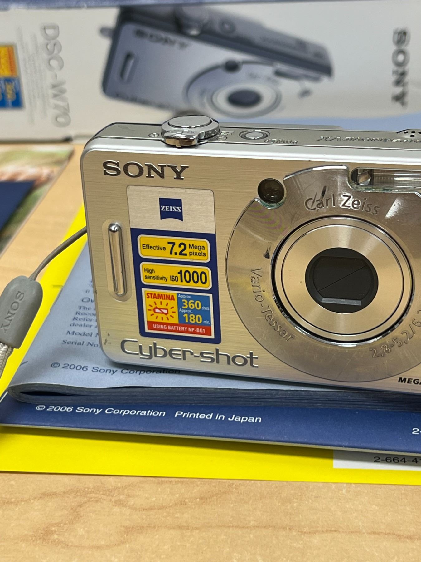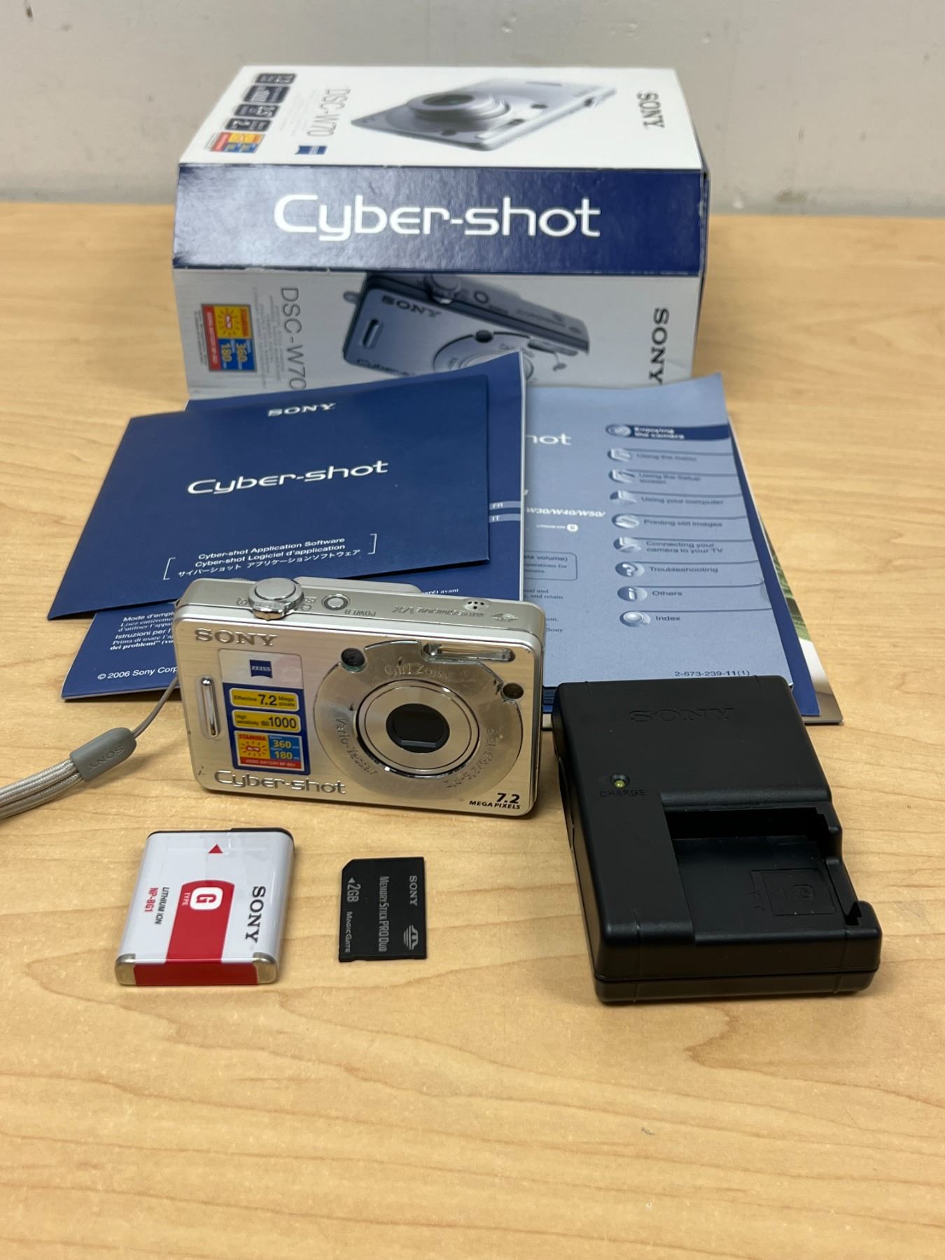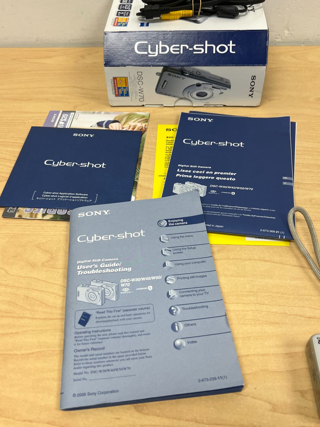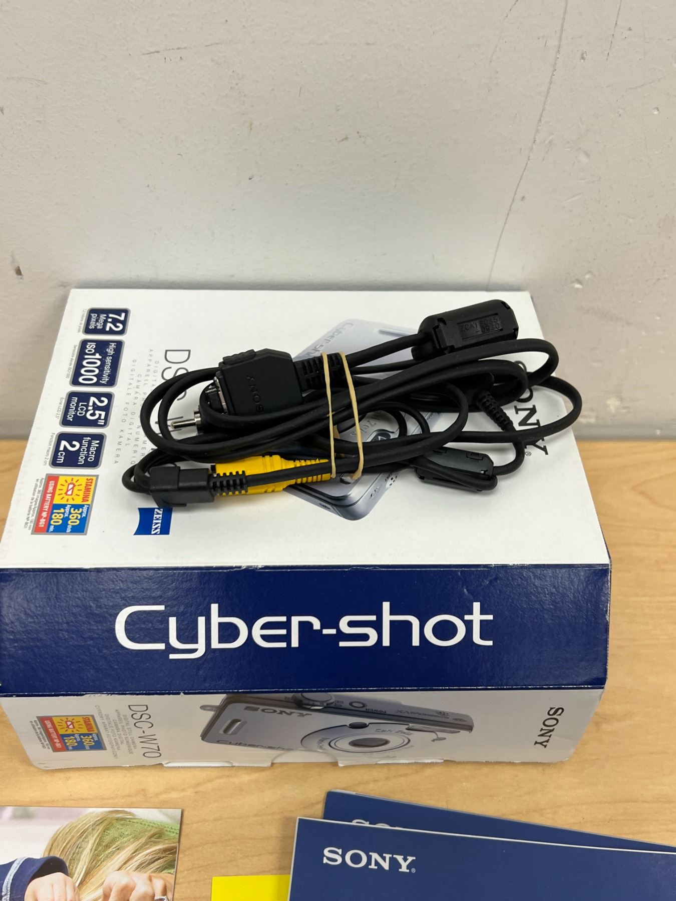 Powered up, not tested. Sony Cyber-Shot DSC-W70 Digital Camera 7.2 MP with box & accessories as pictured