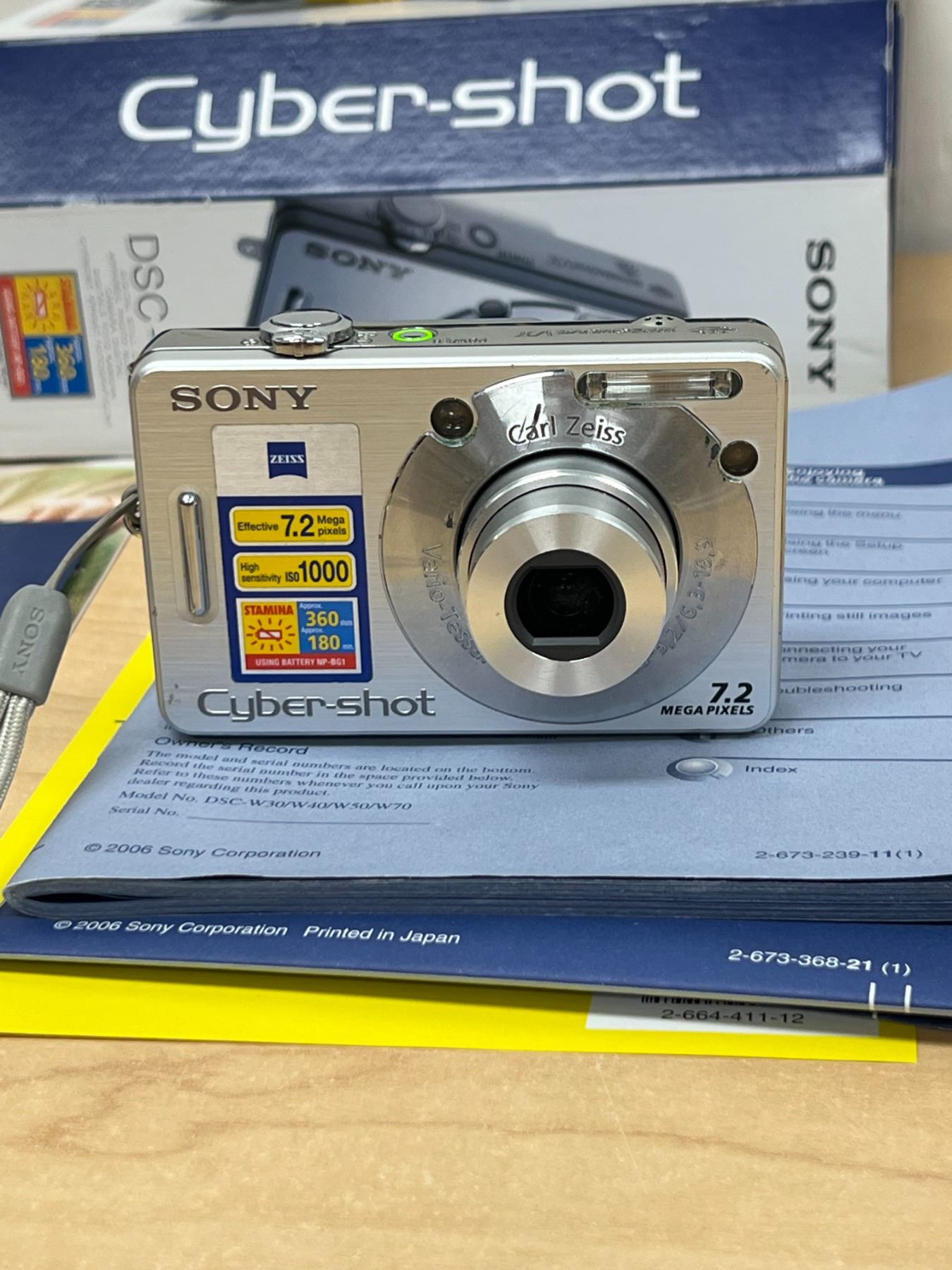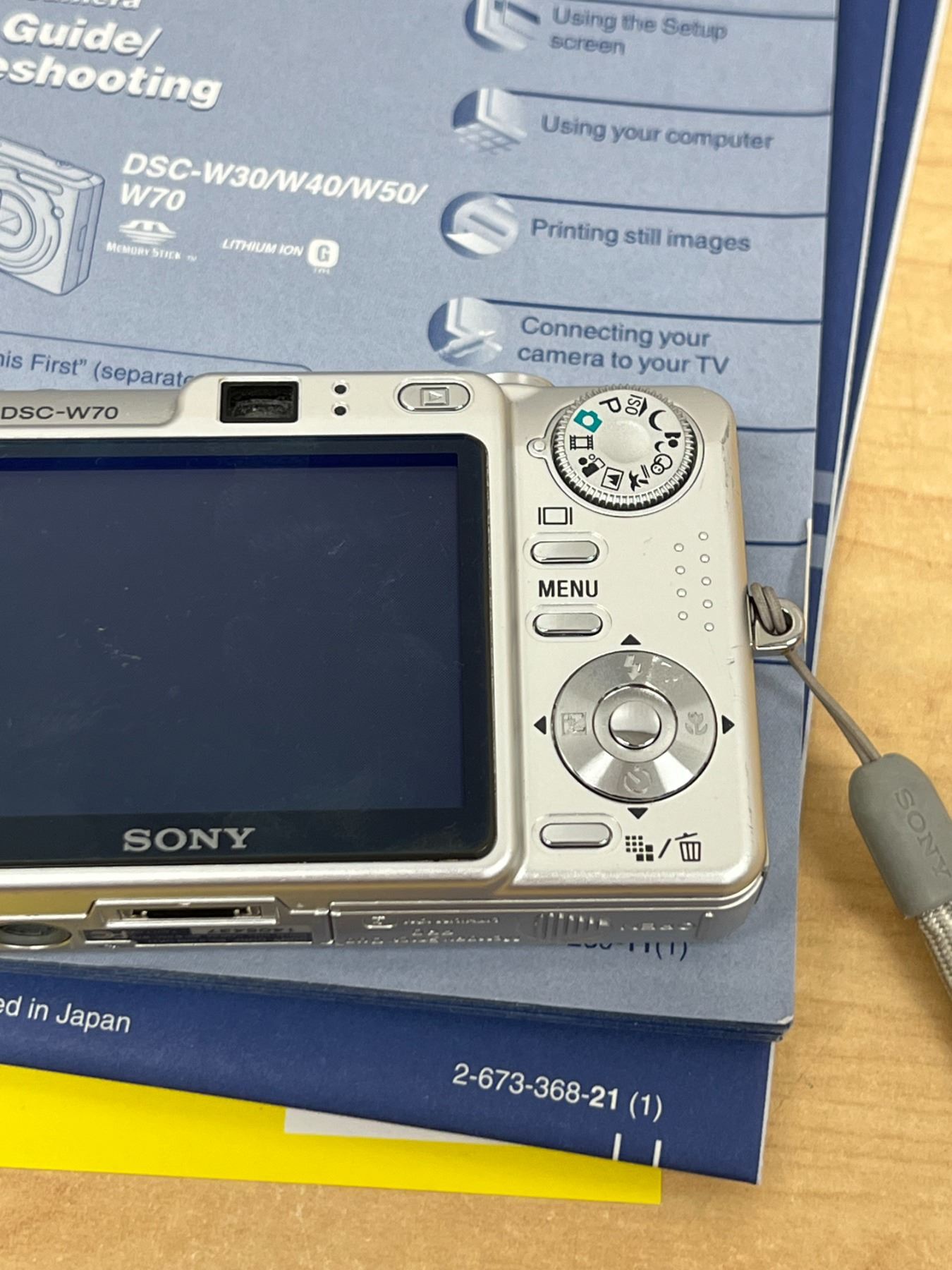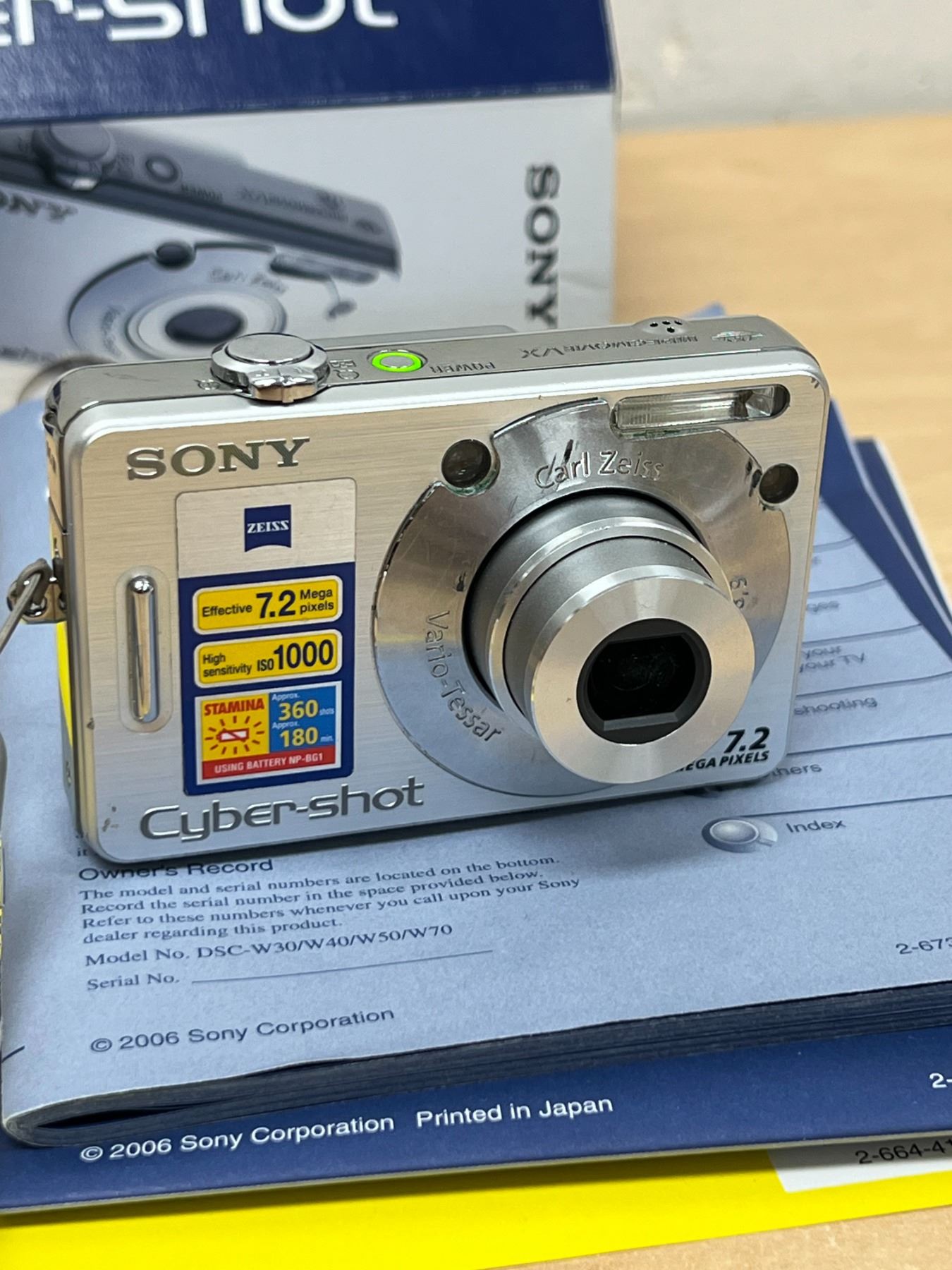 Powered up, not tested. Sony Cyber-Shot DSC-W70 Digital Camera 7.2 MP with box & accessories as pictured