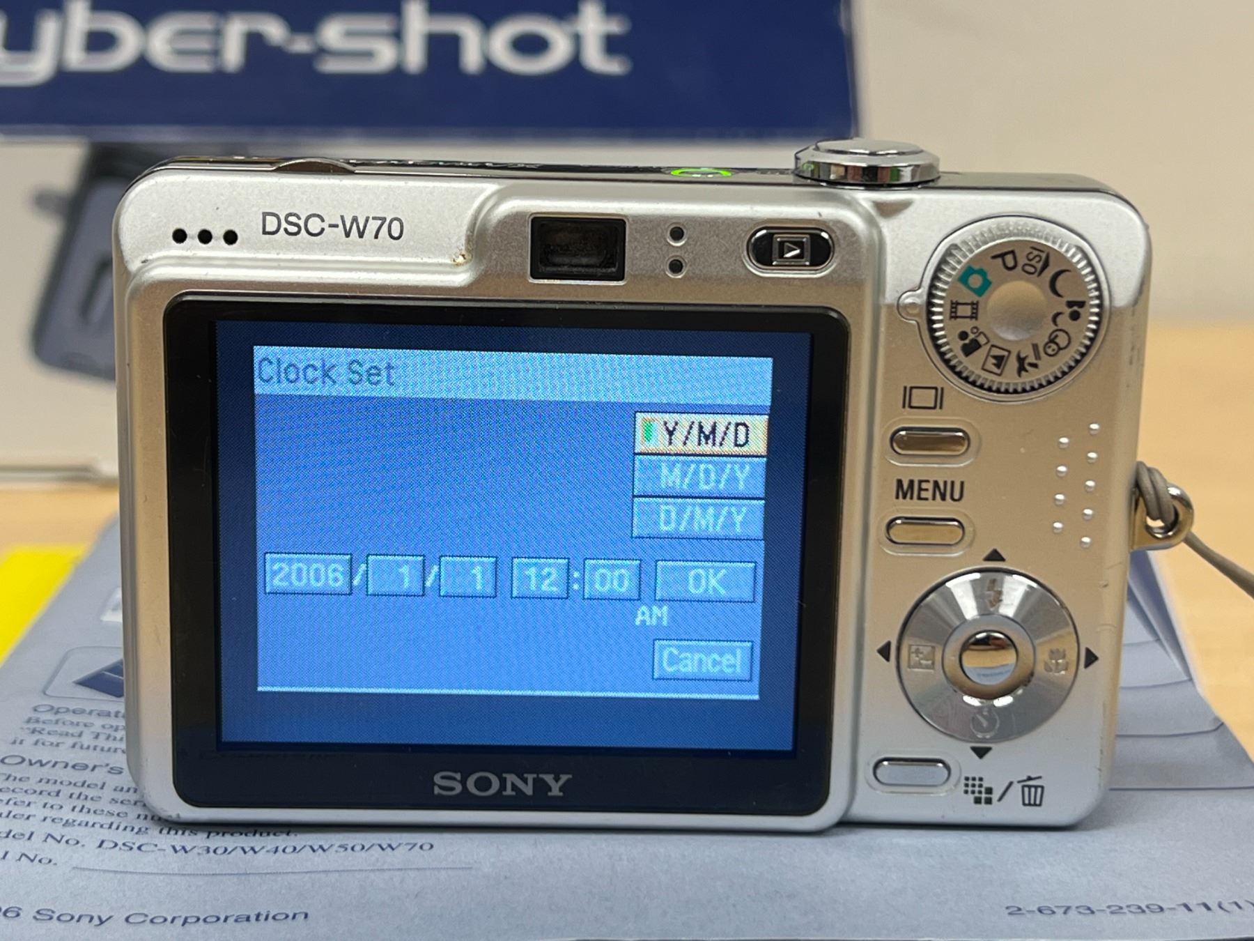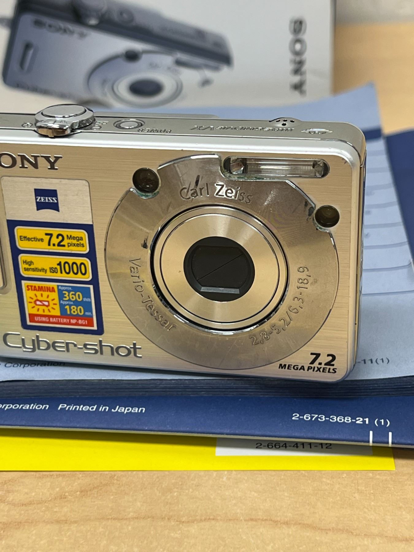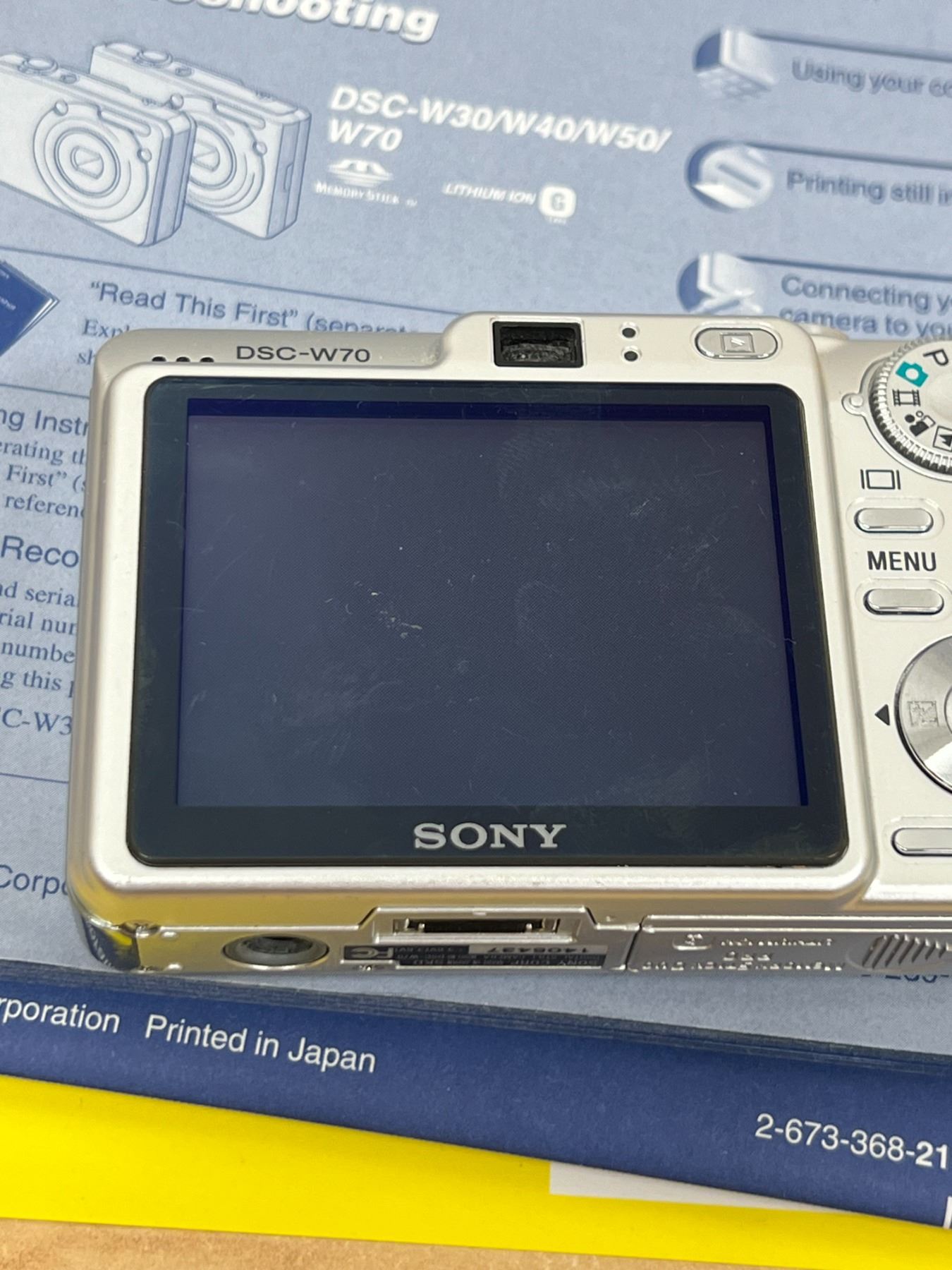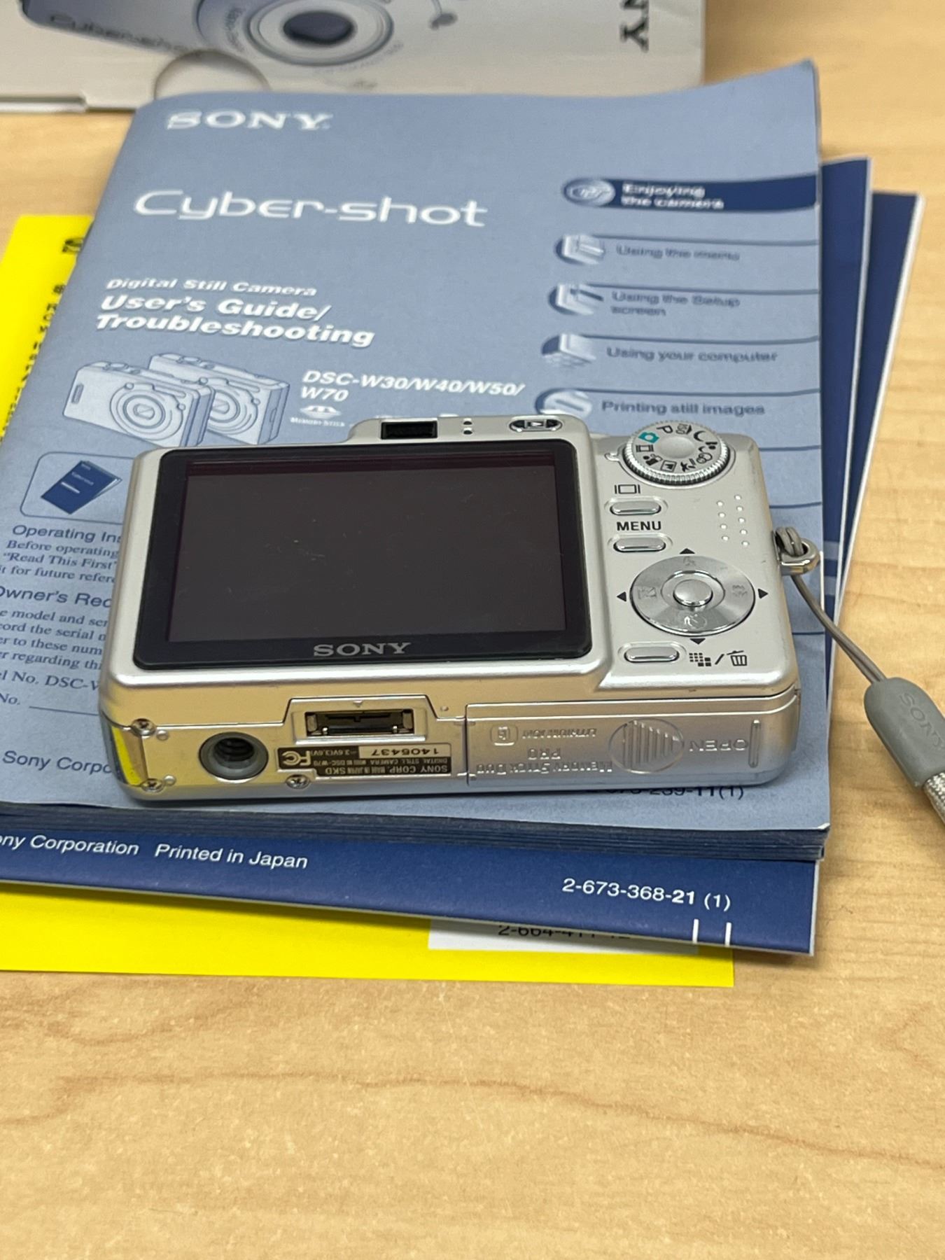 Powered up, not tested. Sony Cyber-Shot DSC-W70 Digital Camera 7.2 MP with box & accessories as pictured