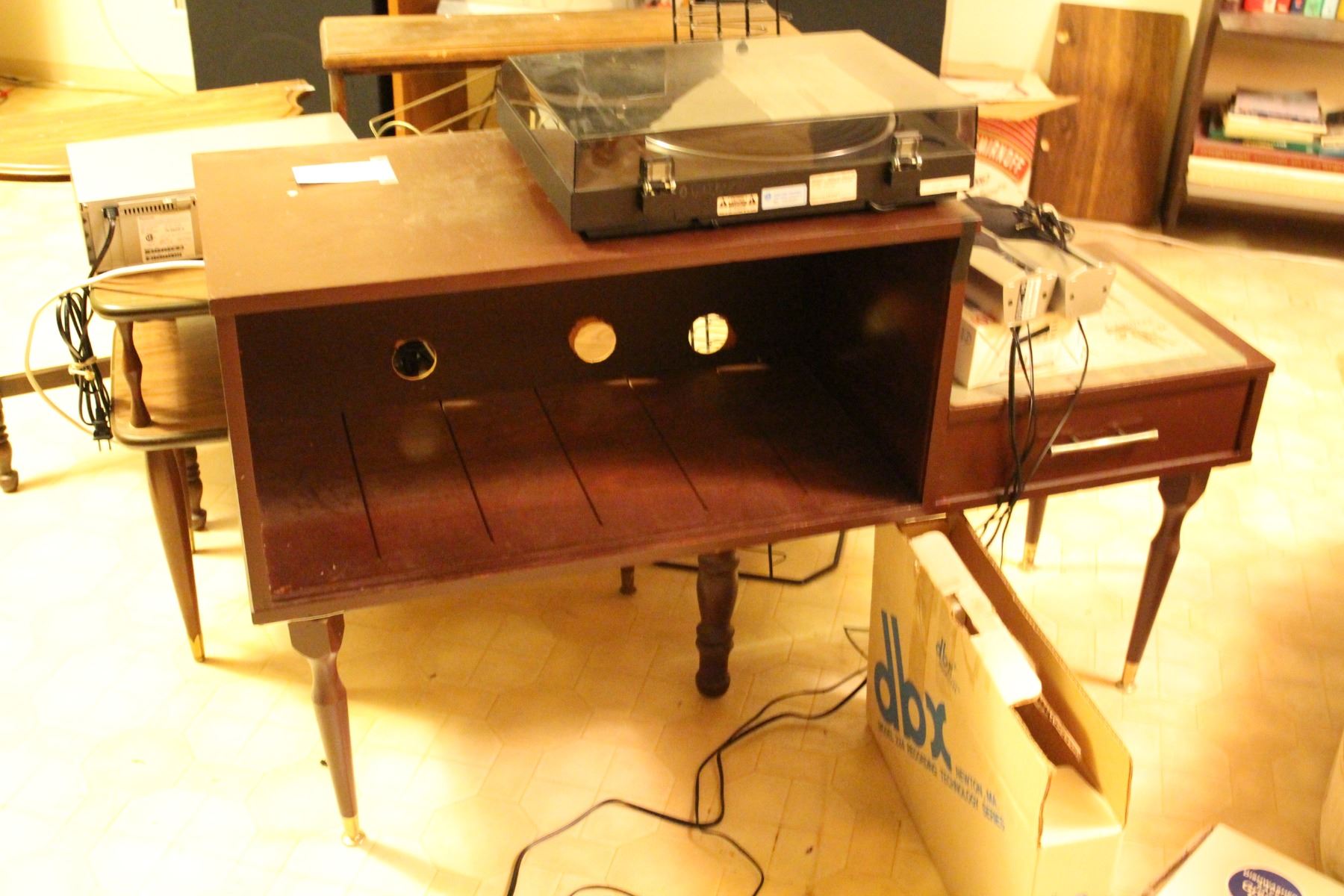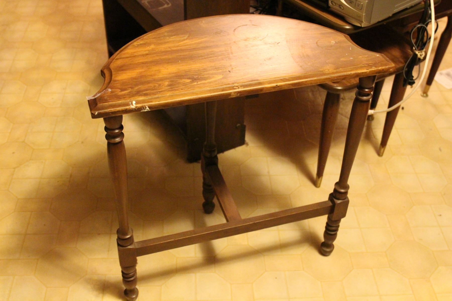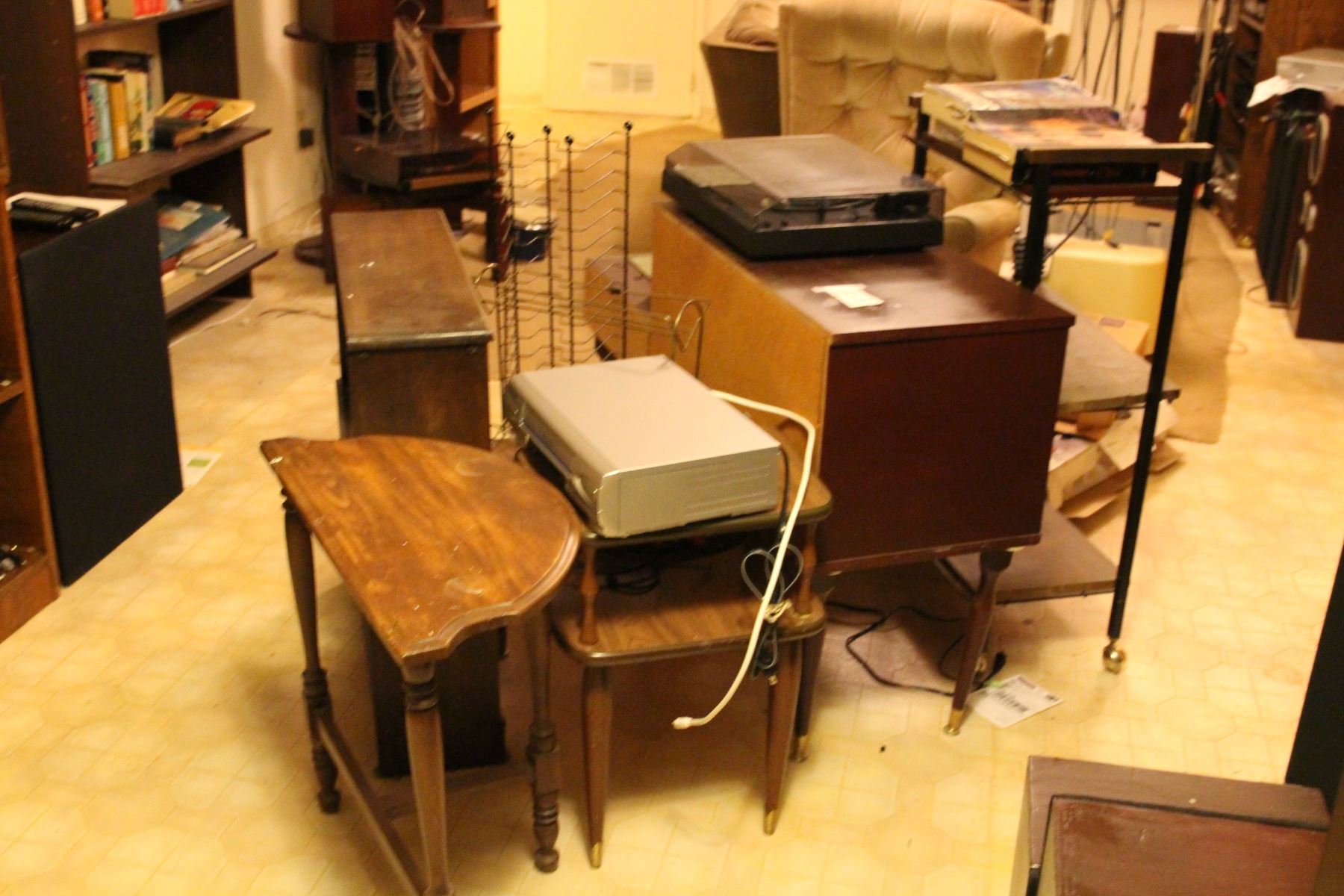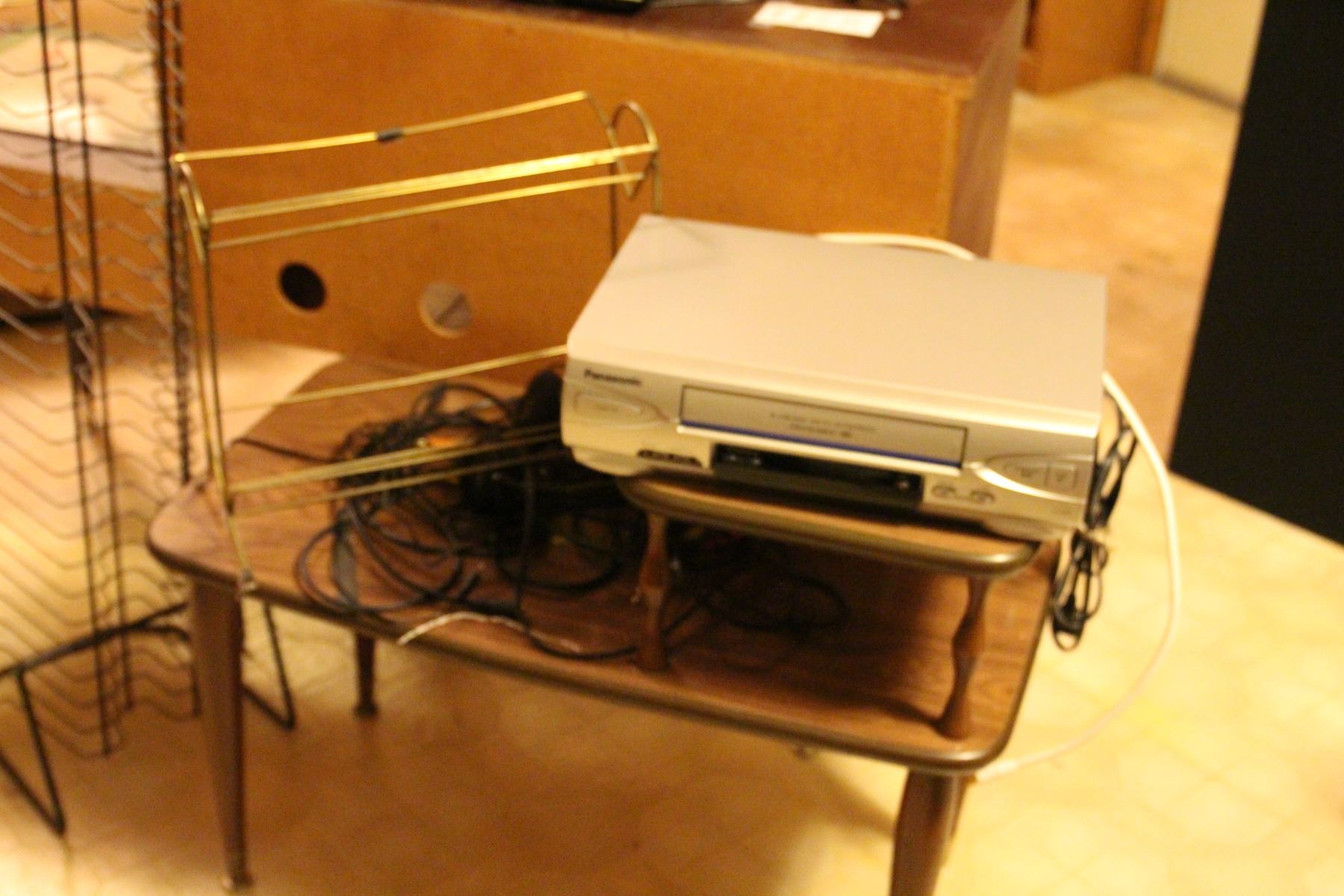 Sony Turn Table, Panasonic VHS player all untested, Rolling shelf unit, telephone tables and half round wood wall table, please note scratches. Bring assistance to move Pickup at 10:00 - 11:00 am