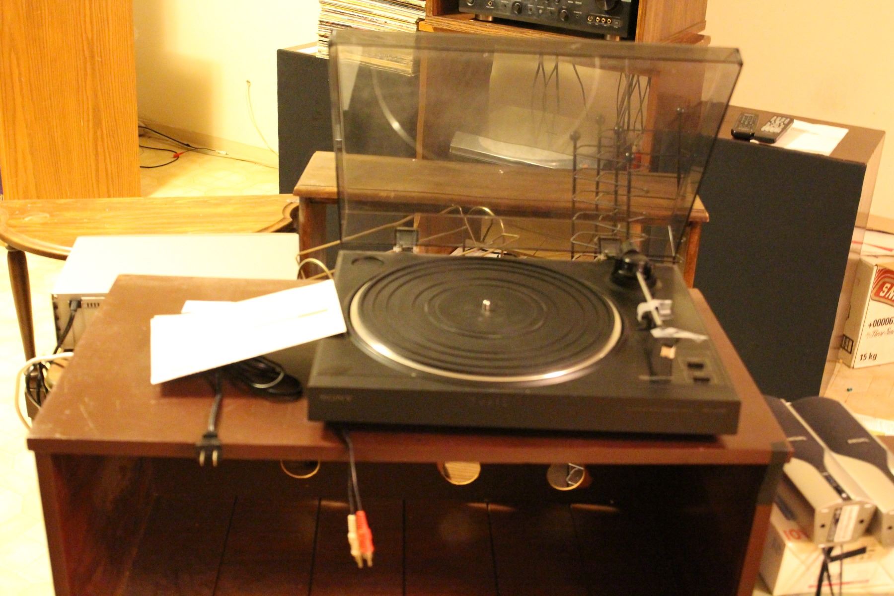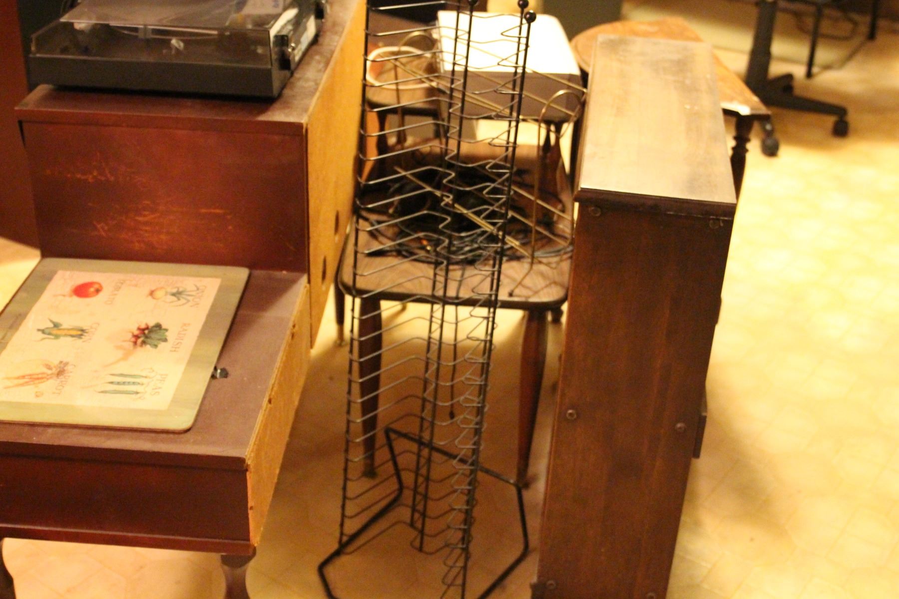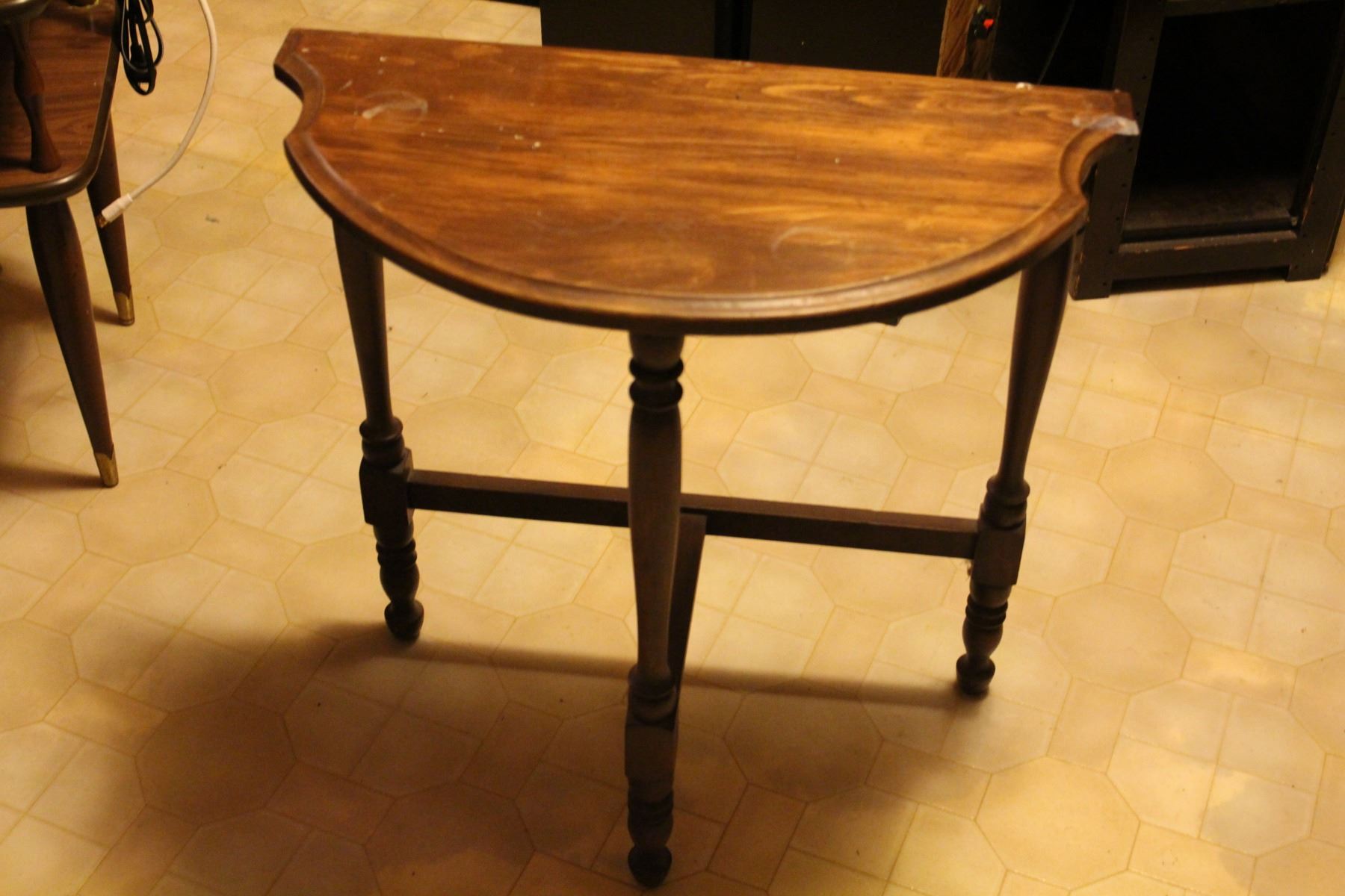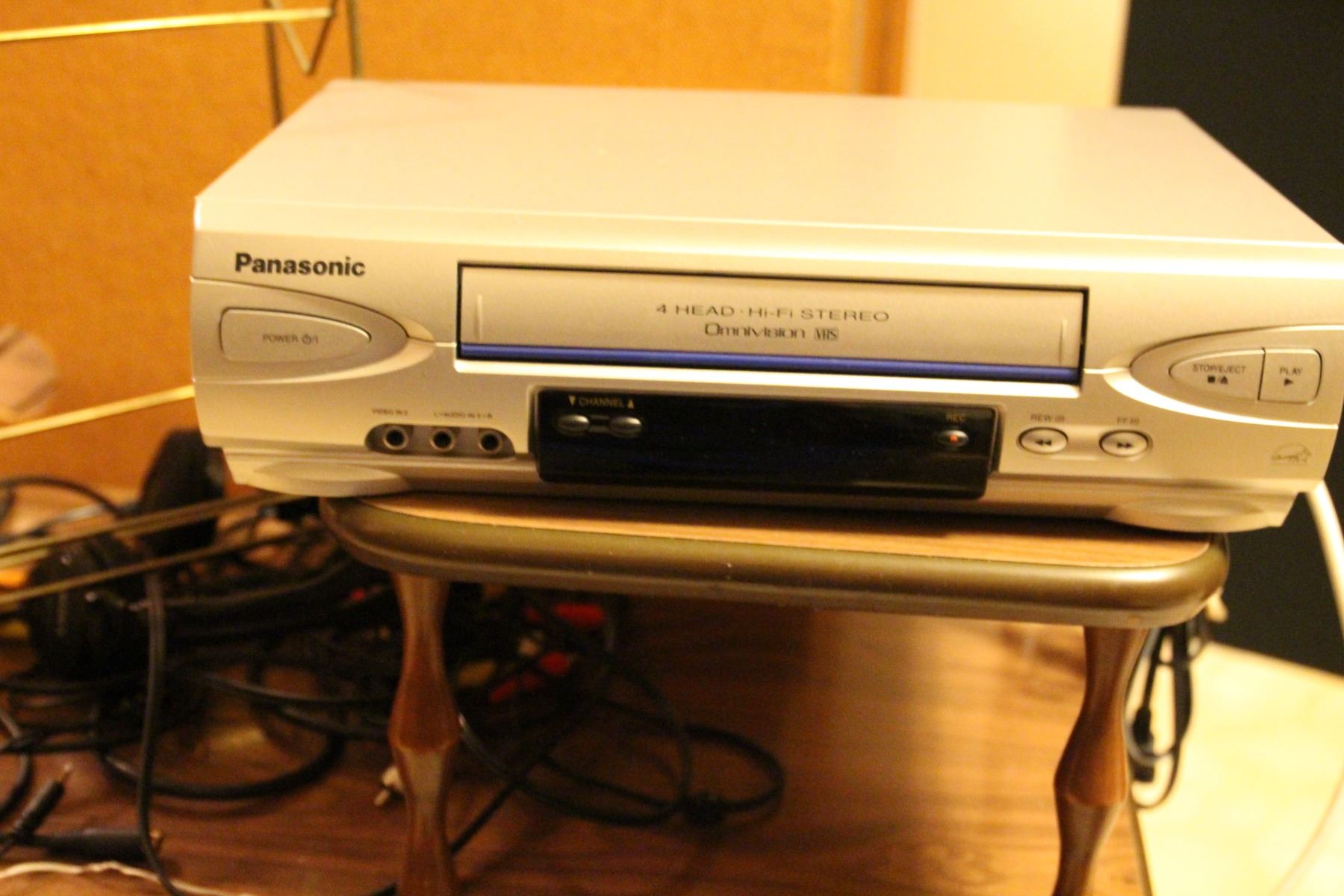 Sony Turn Table, Panasonic VHS player all untested, Rolling shelf unit, telephone tables and half round wood wall table, please note scratches. Bring assistance to move Pickup at 10:00 - 11:00 am