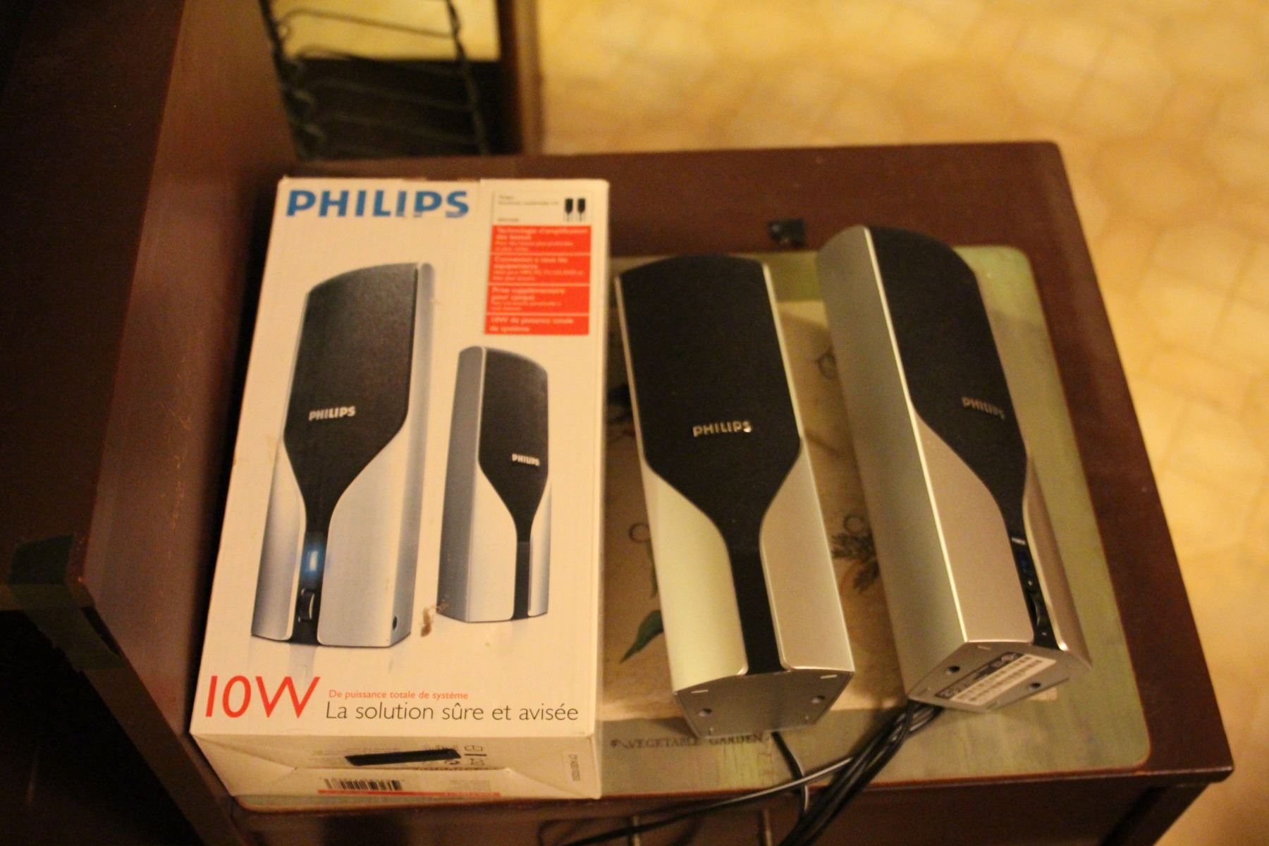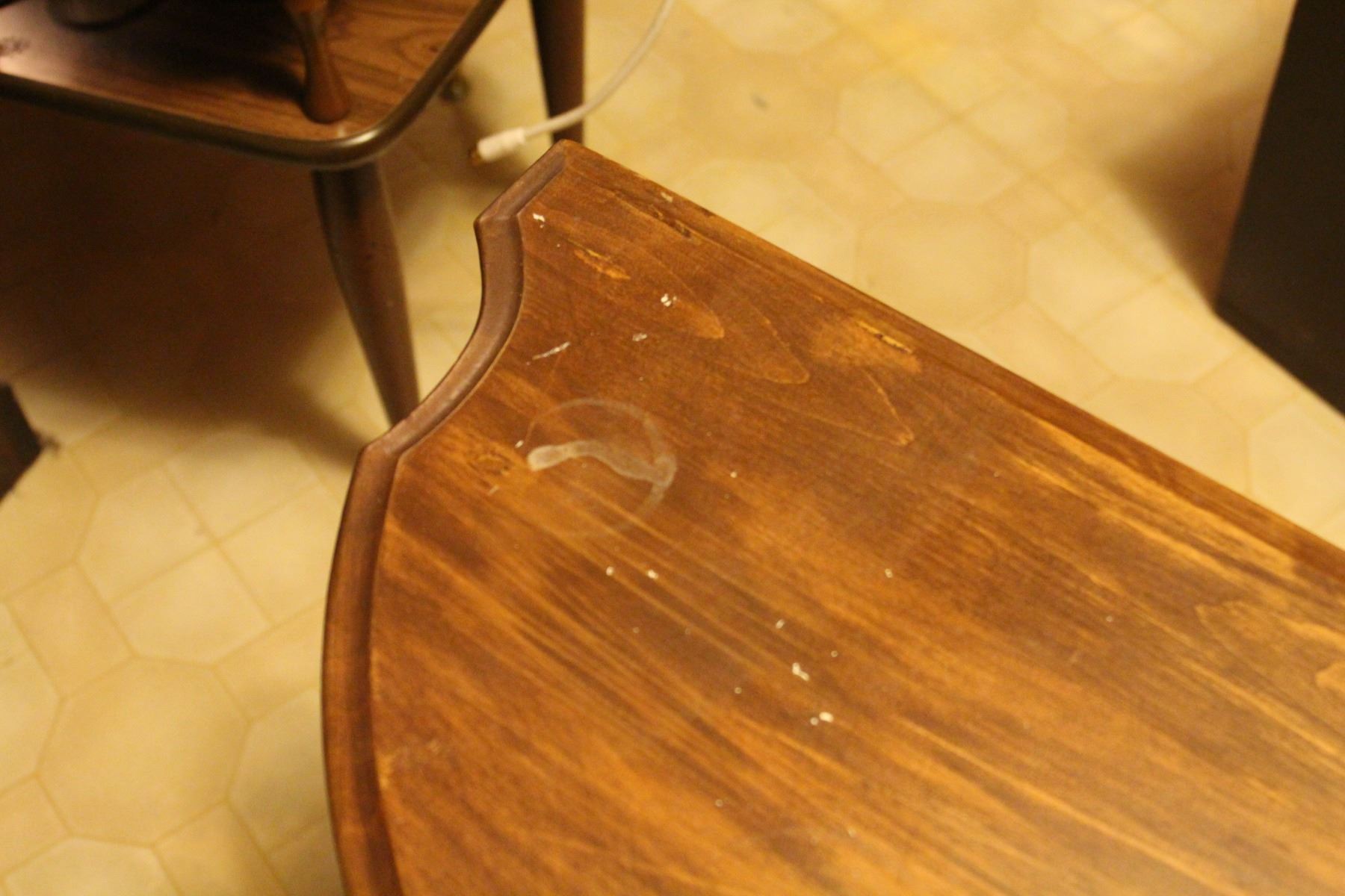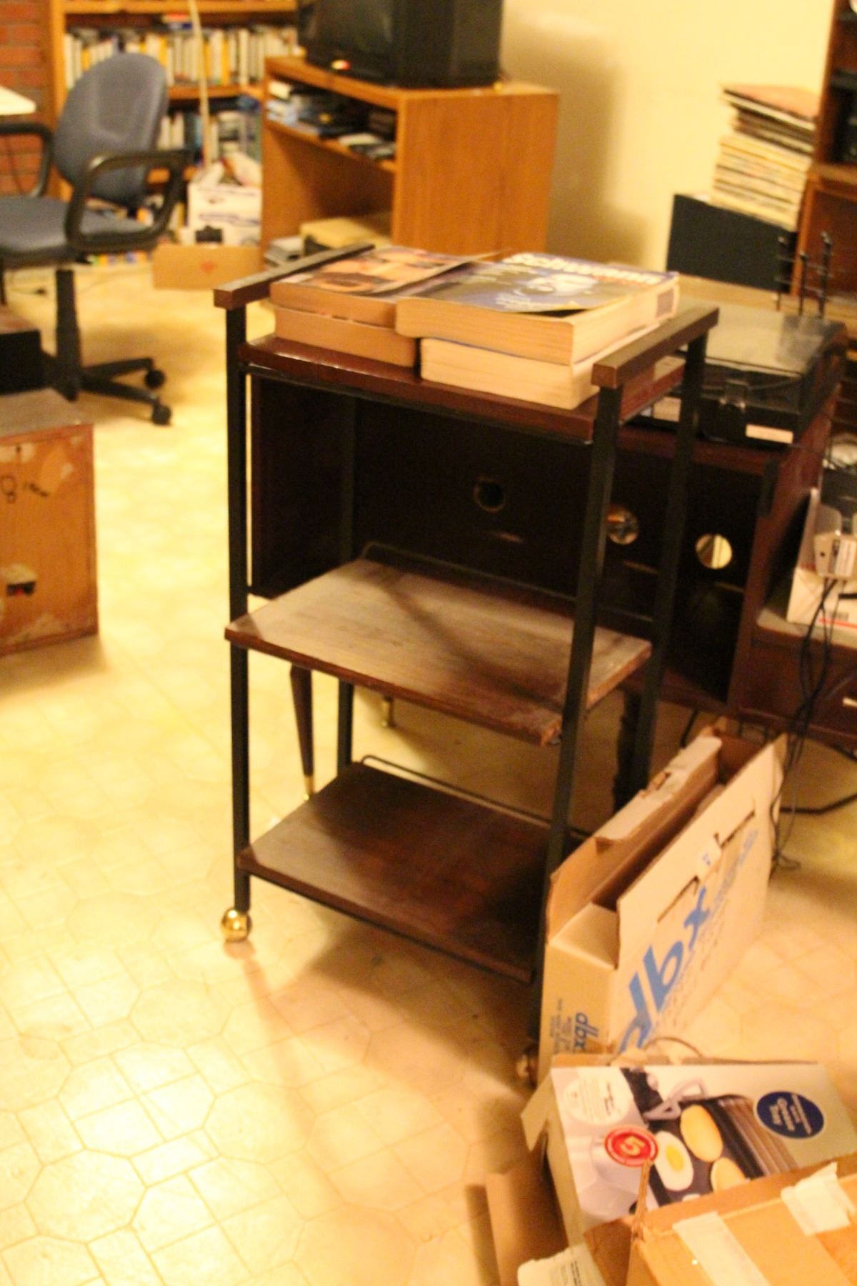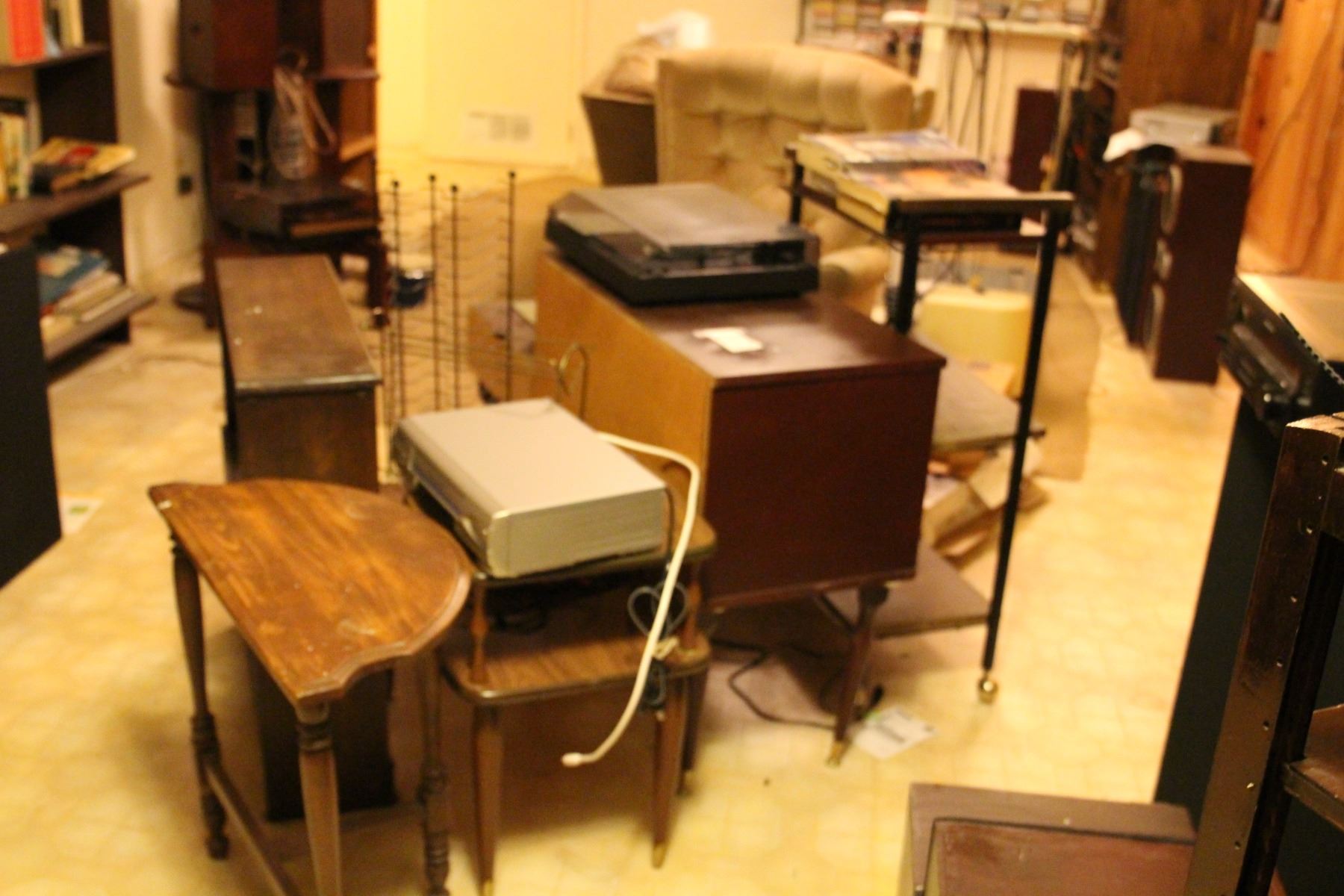 Sony Turn Table, Panasonic VHS player all untested, Rolling shelf unit, telephone tables and half round wood wall table, please note scratches. Bring assistance to move Pickup at 10:00 - 11:00 am