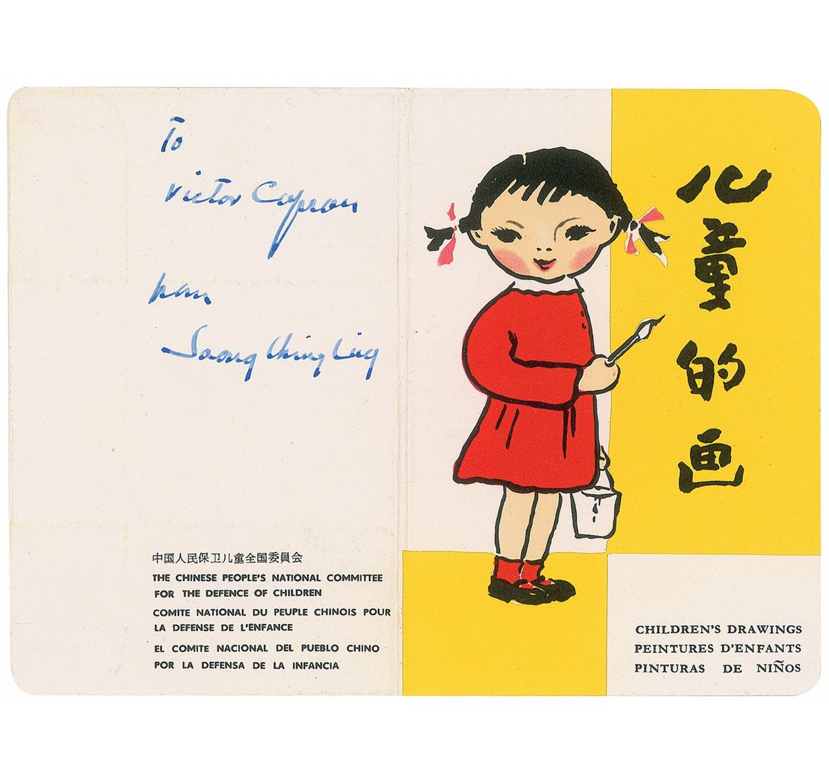 Second vice president of China (1893–1981), who was the second wife of Sun Yat-sen, the leader of the 1911 revolution that established the Republic of China; she was given the special title of Honorary President of the People’s Republic of China in 1981. Blue ink signature, “To Victor Capron, from Soong Ching Ling,” on a “Children’s Drawings” greeting card, measuring 7.75 x 5.75 open. In fine condition, with a couple of tiny surface lines, not affecting the bold signature and sentiment.