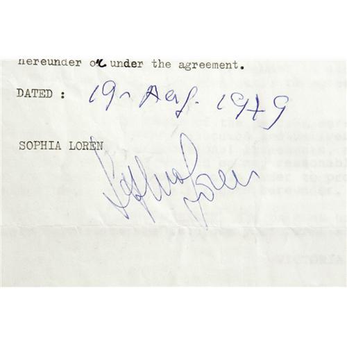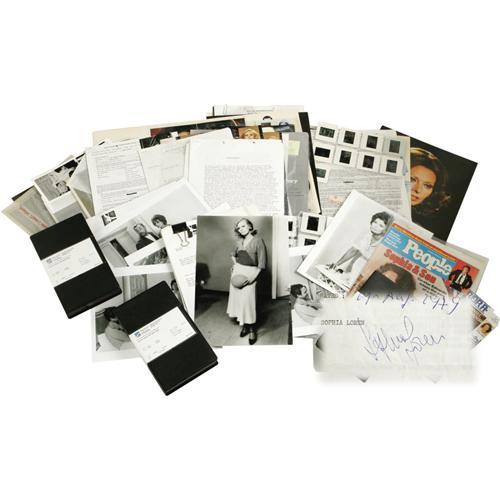 <B>Incredible Sophia Loren Signed Letters, Photos and Archive.</B></I> Large collection of items includes signed and initialed letters from Sophia Loren and Carlo Ponti regarding the 1980 TV biopic <I>Sophia Loren: Her Own Story</B></I>; signed telegrams from Loren to Ponti; three VHS screener tapes of <I>Her Own Story</B></I>; contracts from <I>Her Own Story</B></I> signed by Armand Assante and Rip Torn; production letters for <I>Her Own Story</B></I> and the 1984 drama <I>Aurora by Night</B></I>; publicity photos for both films with negatives, color proof sheets, and color slides; and a copy of the October 22, 1984, issue of <I>People</B></I> with Loren on the cover and mentions of both films.<BR><BR><b>Shipping:</b> Flat Material, Large (<a target="_blank" href="http://www.heritageauctions.com/common/shipping.php">view shipping information</a>)
