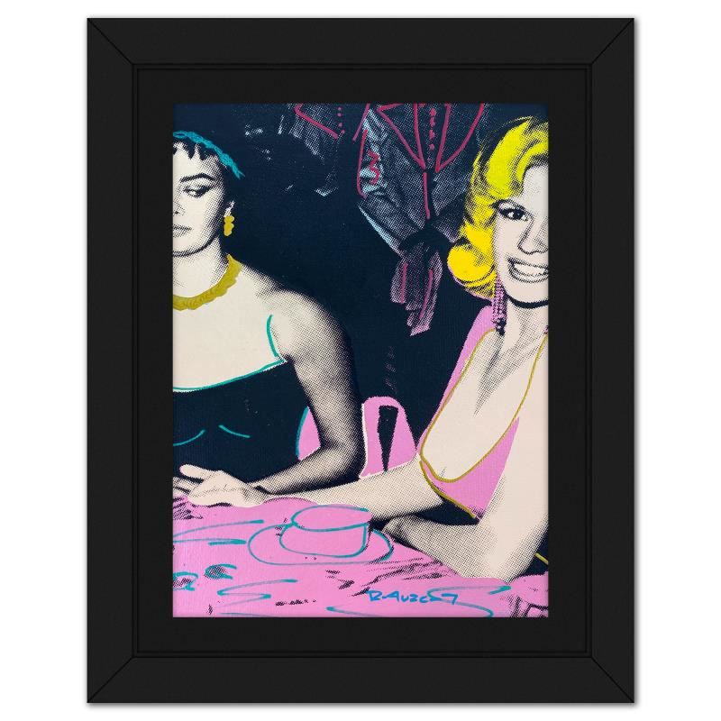 "Sophia Loren and Jane Mansfield" is a one-of-a-kind hand-pulled mixed media silkscreen on canvas by Ringo (Daniel Funes) - protege of Andy Warhol's apprentice, Steve Kaufman.This piece is hand signed by the artist. This piece comes custom framed. Includes Letter of Authenticity. Measures approx. 17" x 13" (frame), 14" x 10" (image). This item requires special handling and may have a longer than usual turnaround.