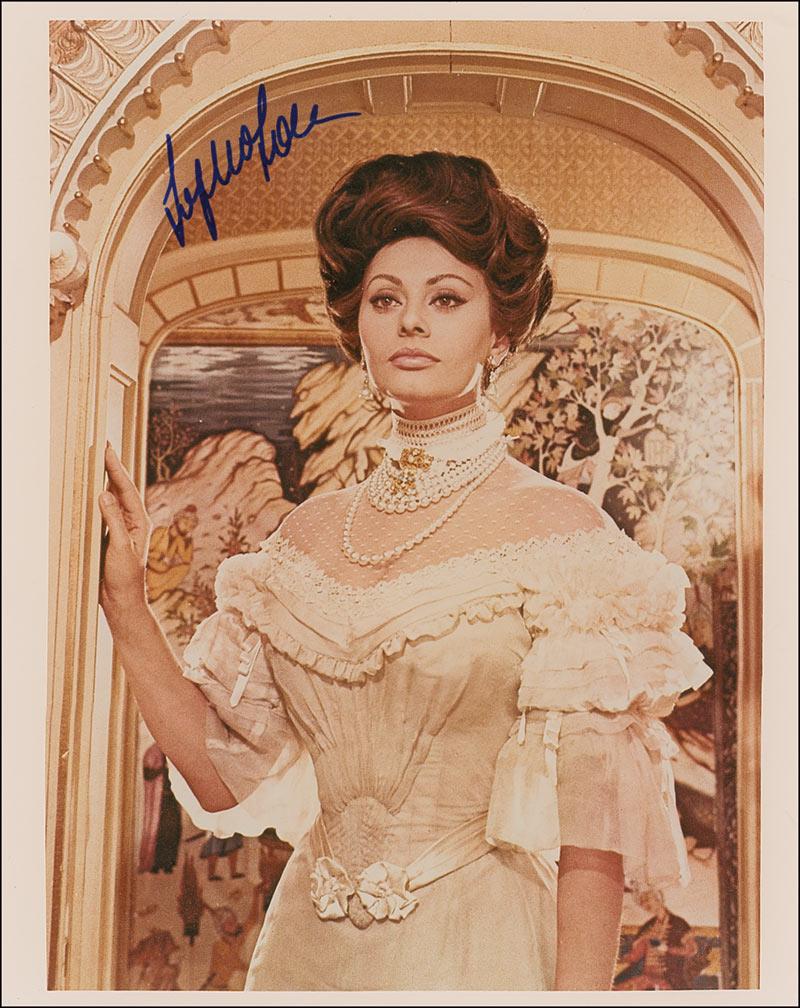 Attractive color glossy 8 x 10 photo of Loren in a period costume, signed in blue felt tip. In fine condition.