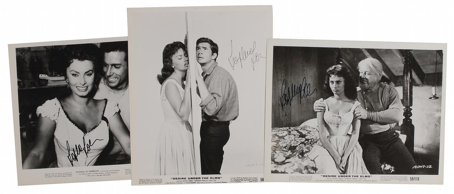 Three signed photos: a vintage glossy 8 x 10 promotional photo for Desire Under the Elms, signed in black ink; and two vintage glossy 10 x 8 promotional photos, both signed later in black felt tip. In fine condition, with some scattered light creasing and some mild crazing to finish of one of the photos.