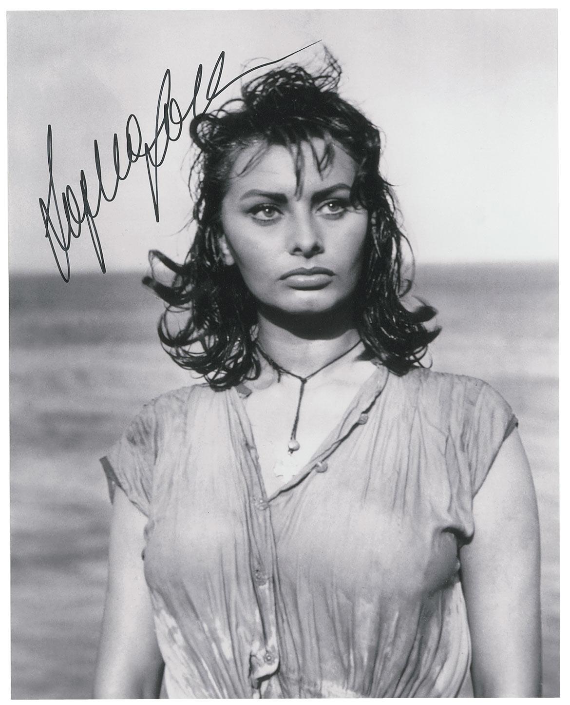 Satin-finish 8 x 10 photo of Loren looking none to happy about her wet dress, signed in black felt tip. In very fine condition.