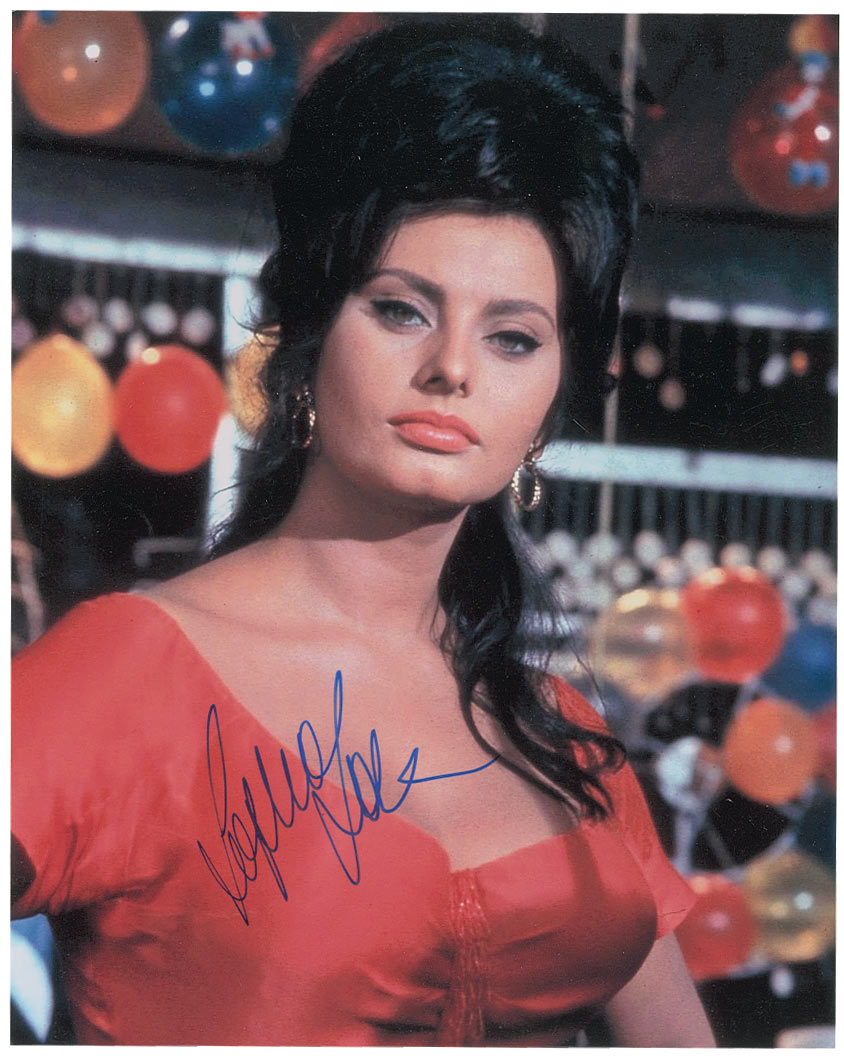 Two different color 8 x 10 photos, one glossy image featuring Loren soaked on a ship, and a satin-finish shot of the busty actress in red. In fine condition.