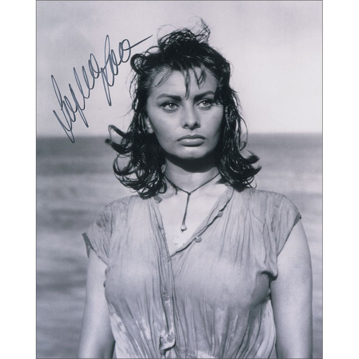 Two satin-finish 8 x 10 photos, one of Loren in black lingerie, and the other of the actress looking none too happy about her wet dress, both signed in black felt tip. In fine condition.