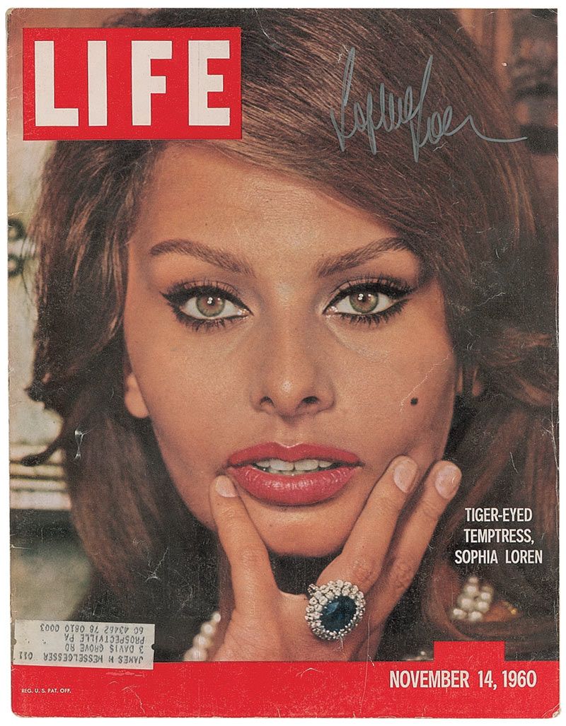 Life magazine, dated November 14, 1960, signed on the front cover in silver ink. Address label affixed to lower left, scattered creasing, and a musty odor, otherwise fine condition.