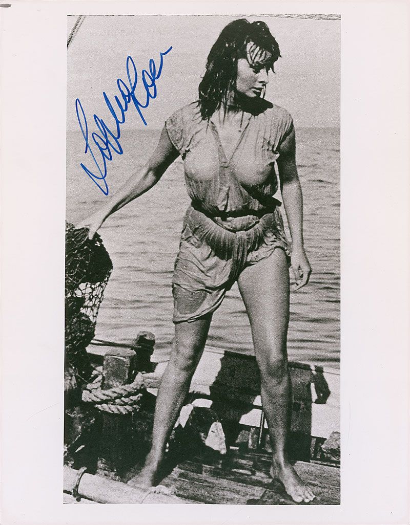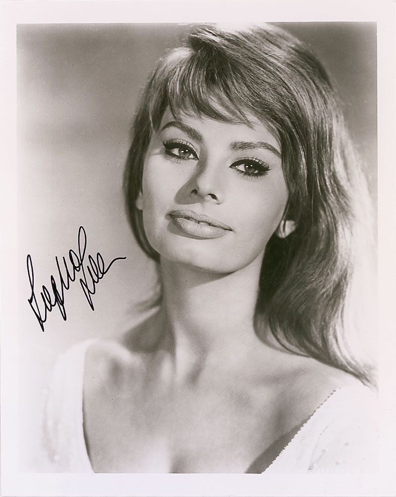 Two different glossy 8 x 10 photos, including one of Loren in a wet see-through dress, signed in black and blue felt tip respectively. In fine condition.