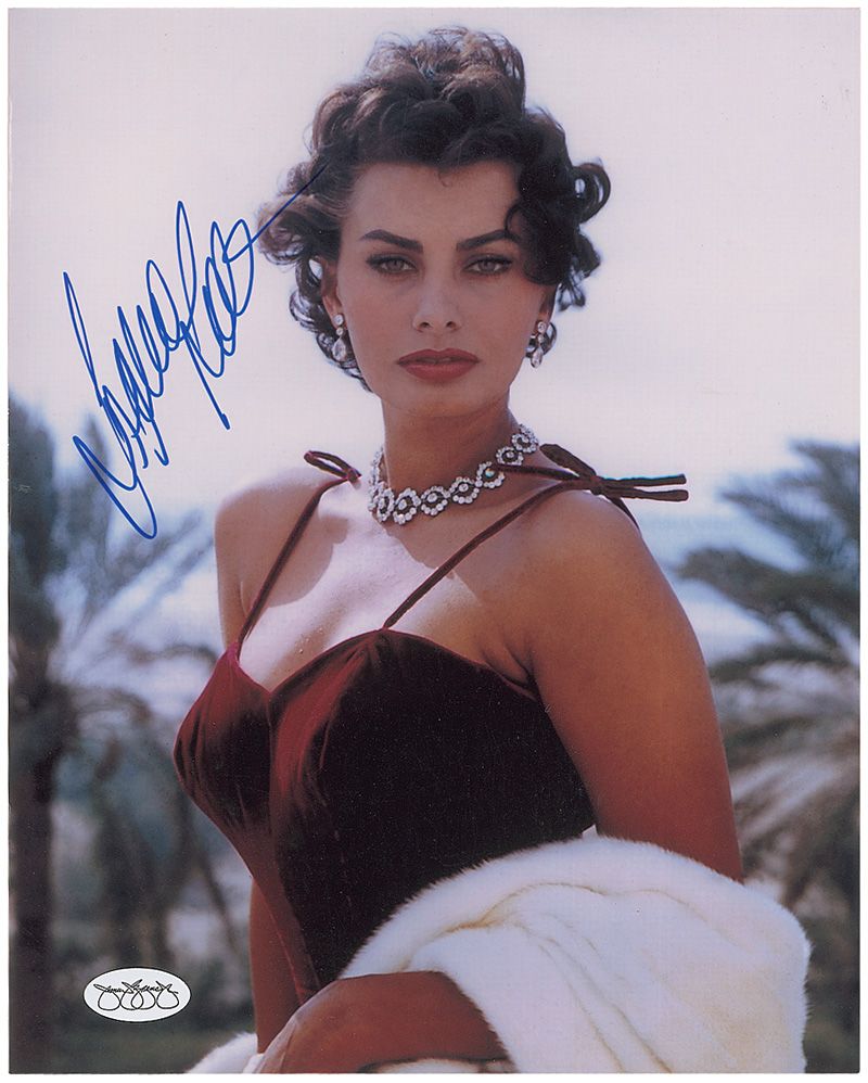 Classy color satin-finish 8 x 10 photo of the beautiful Loren, signed in blue felt tip. In fine condition, with a JSA authentication label affixed to lower left corner.