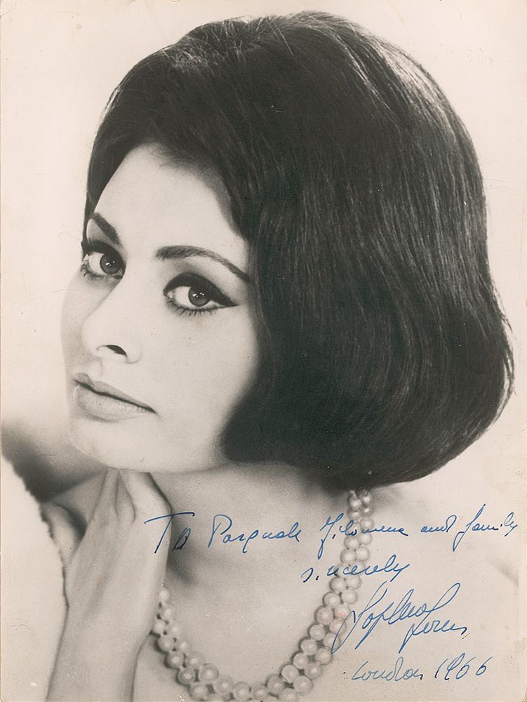 Vintage matte-finish 7 x 9.25 photo, signed and inscribed in fountain pen “To Pasquale Gilovena and family, sincerely, Sophia Loren, London 1966.” Trimmed edges and some scattered light soiling, otherwise fine condition.