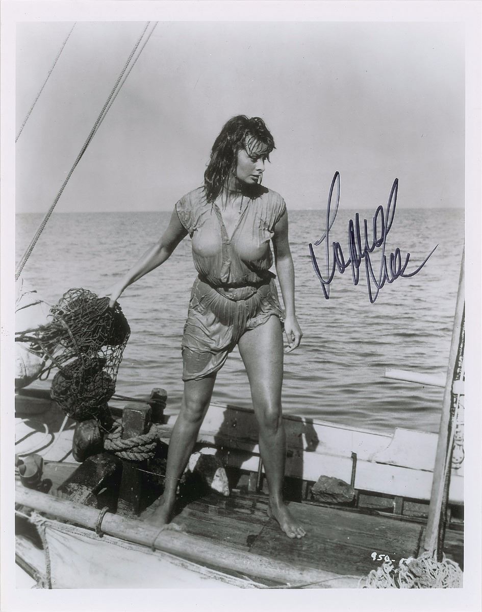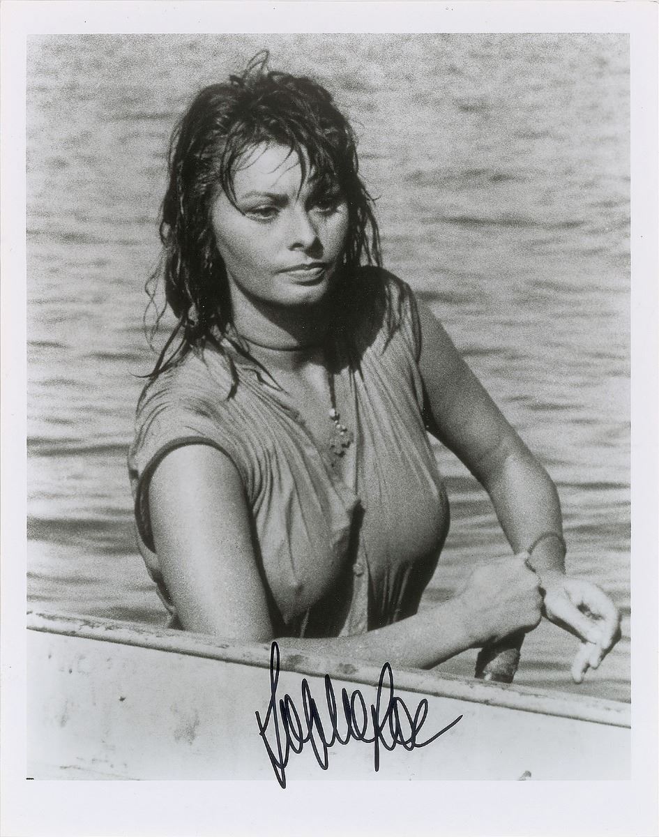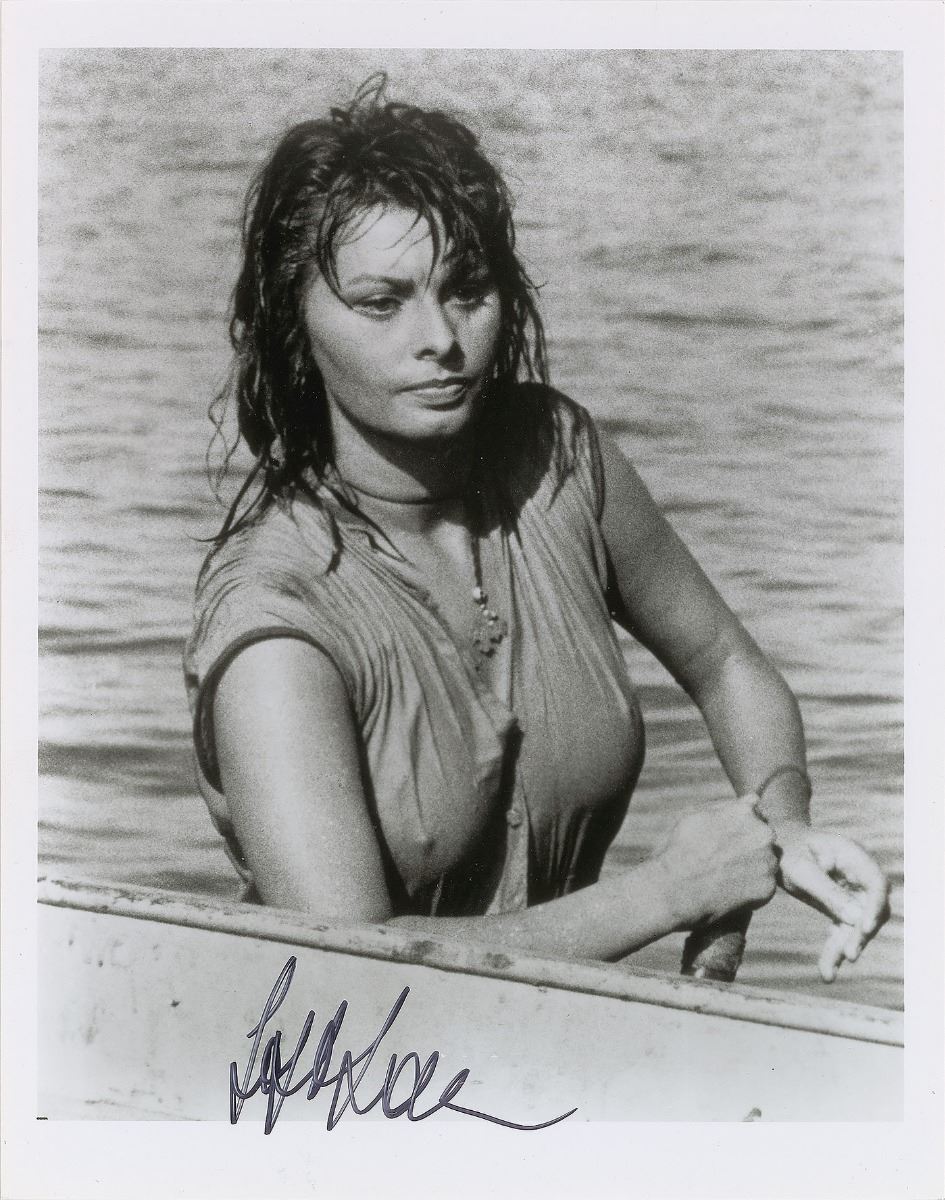 Three glossy 8 x 10 photos of the soaking wet Loren from the 1957 film Boy on a Dolphin, each signed in felt tip. In overall very fine condition.