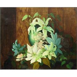 Oil on canvas, signed, "Clematis & Lilies", 46 x 56 cm, text á tergo: Sophie Marr, The Jerets, Kingswood, Hockley Heath, Warwickshire; minor repairs and retouches
