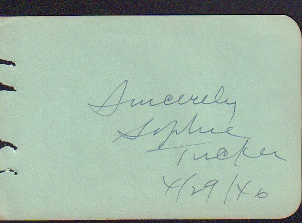 Autograph book page signed by Sophie Tucker and dated 1946. All items come with a certificate of authenticity good for the life of the piece.
