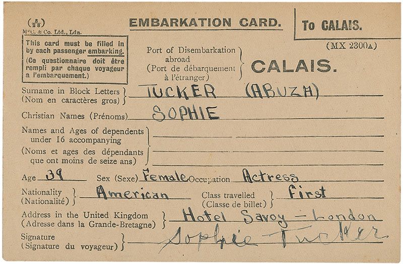 Tucker’s rare embarkation card, one page, 6 x 4, no date. Embarkation card is filled out, most likely by Tucker, including her printed full name “Sophie Tucker (Abuza),” age “39,” occupation “actress,” and address in the UK “Hotel Savoy—London.” Signed at the bottom in black felt tip “Sophie Tucker.” In fine condition, with expected light corner wear from handling and portions of signature lighter than others, though fully legible. Embarkation cards, also known as a departure cards, are used by immigration authorities as a means of passenger identification and record of entry and departure between countries.