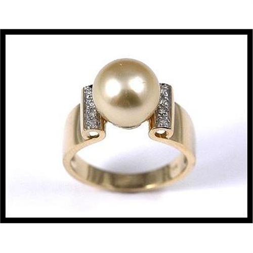 Graceful ring with 1 south sea pearl and 8 full cut diamonds that weigh 0.12 carats set in 14K yellow gold. The size 7 ring measures 8.3 millimeters (0.33 inches) wide and weighs 5.0 grams total weight. The pearl measures 10.3 millimeters (0.41 inches).