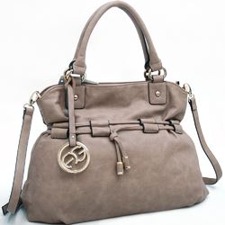 Sophisticated Drawstring Shoulder Bag w/ Logo Charm - Taupe Grey