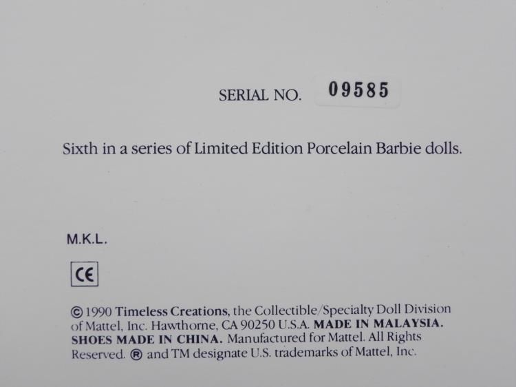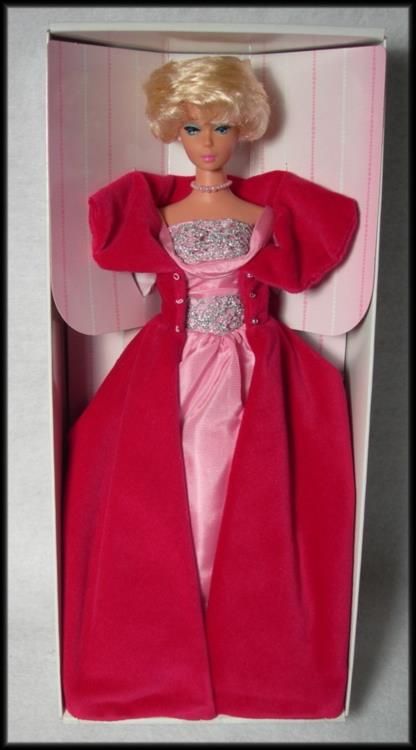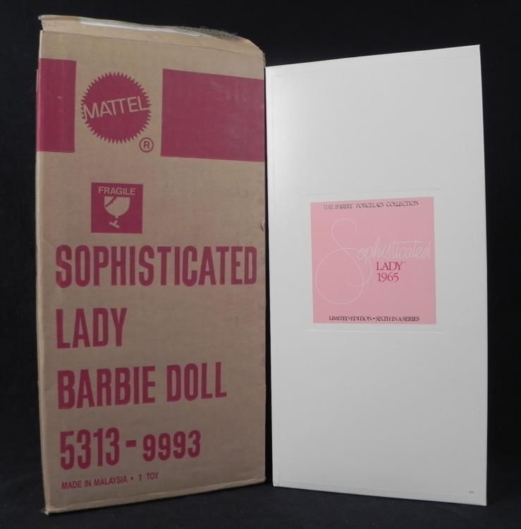 This Sophisticated Lady Barbie doll looks quite the sophisticate, in porcelain. She is in Mint condition, from a non-smoking home, and has never been removed from the box. Also included is the original shipping box, direct from Mattel. The serial number is 09585. She is made from porcelain, and wears a pink taffeta ballgown, with silver-tone filigree lace, has a wide, sweeping skirt. She is the third doll in the Collectors' Request Collection. The picture shown is representative. This is a classic, charming retro Barbie with that French flair!