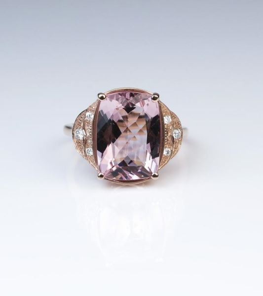 featuring a cushion cut morganite weighing approx. 7.00-8.00 carats accented with 6 side diamonds set in a 14K rose gold setting.