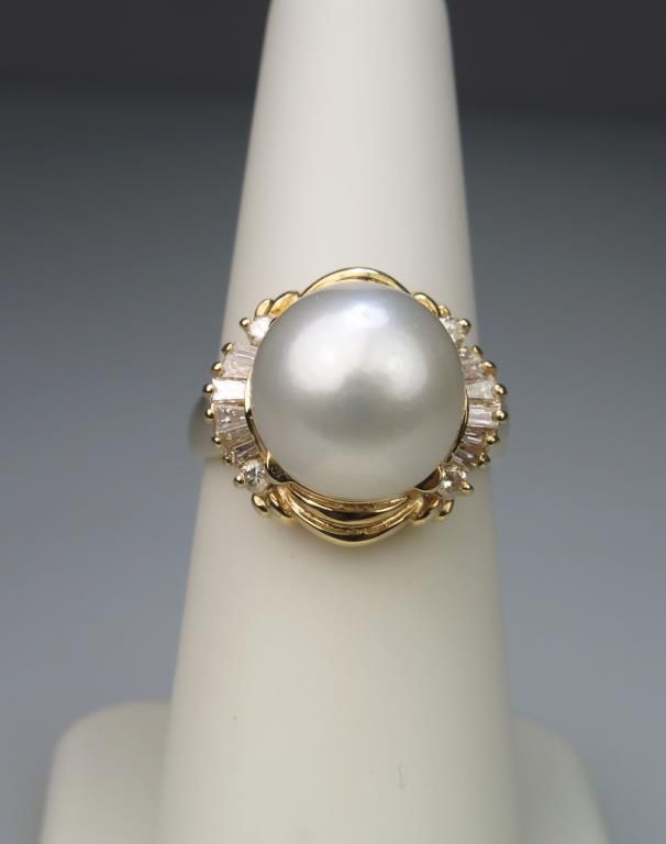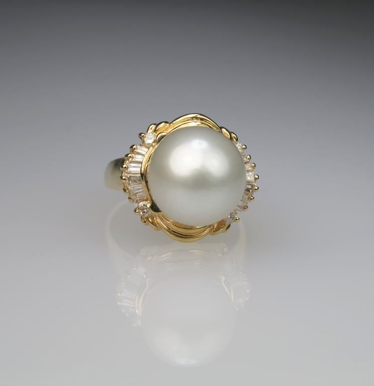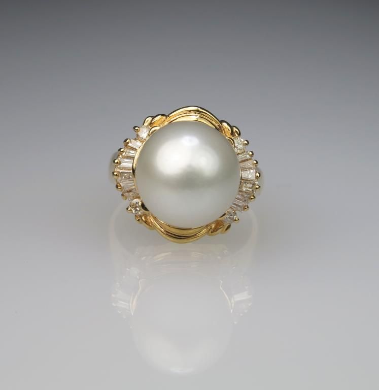 Sophisticated South Sea 12.00 mm Pearl and Diamond Ring beautifully made with 16 round and baguette cut Diamonds with G-H colors and SI clarity set in 18 karat yellow gold. Retail $2,000-$2,500 Estimate $1,100-$1,400.