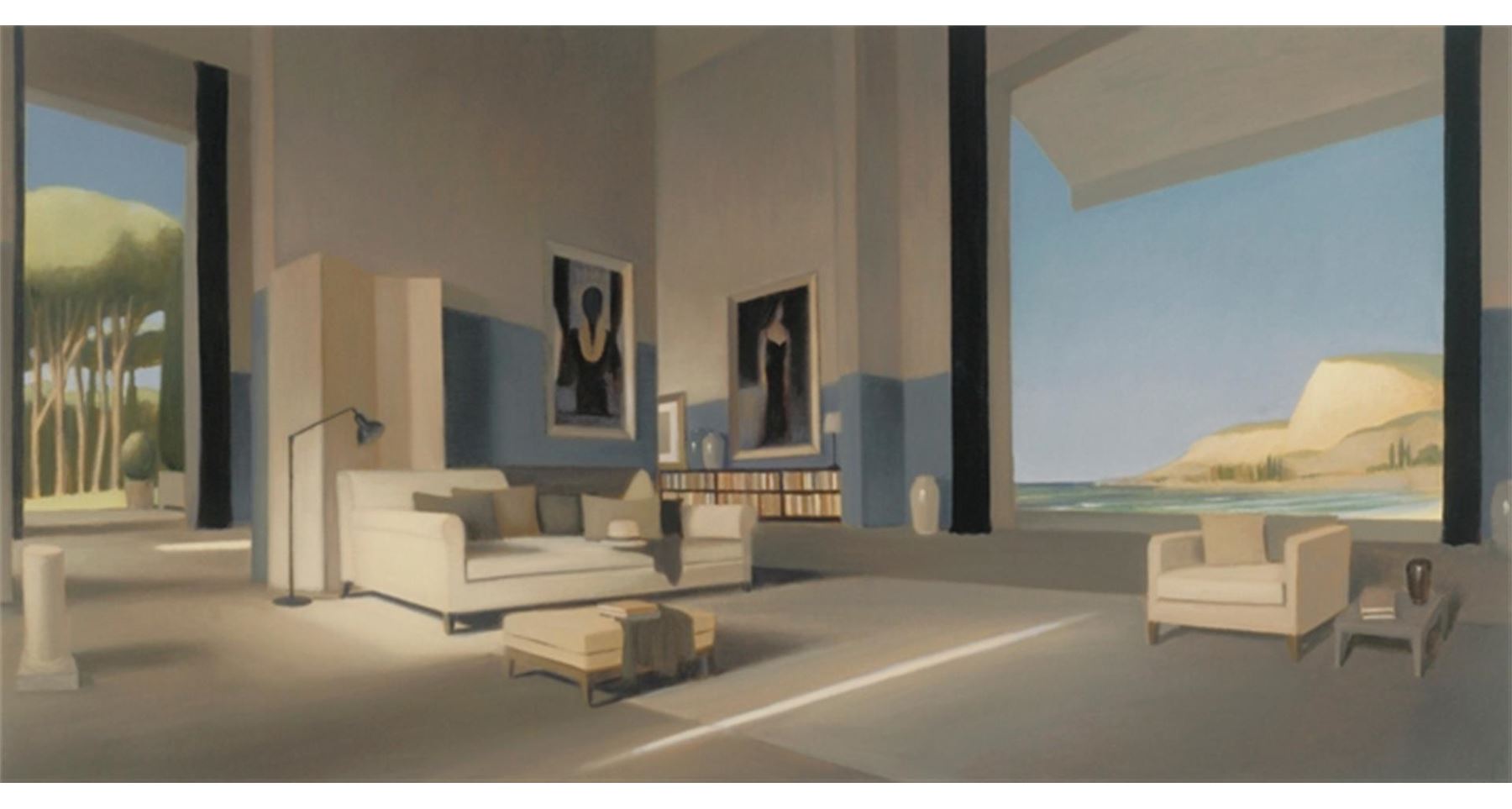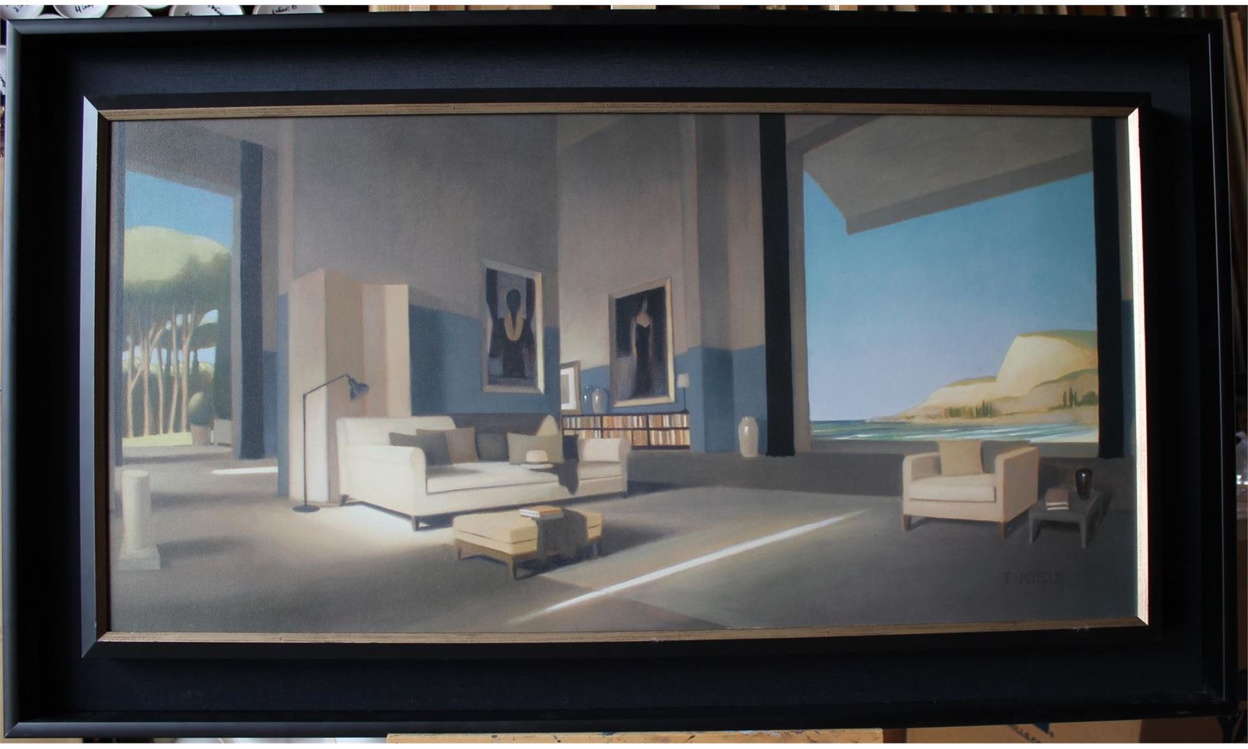 The modern layout of an upper-class home, which includes two large paintings of women, book shelves, and seating arrangements below voluminous windows, overlooks magnificent outdoor views in this oil painting by contemporary French artist, Thierry Mysius.