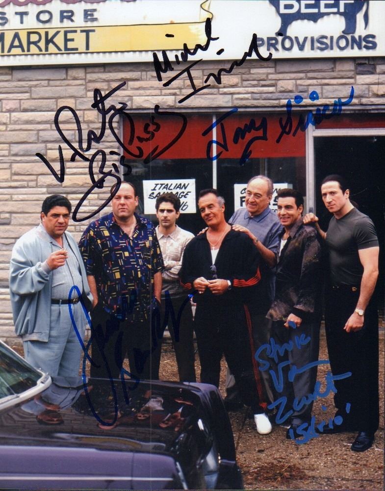 A color cast signed 8x10 by James Gandolfini (Deceased) Tony Sirico (deceased) Michael Imperioli Steven Van Zandt and Vincent Pastore (deceased) with COA