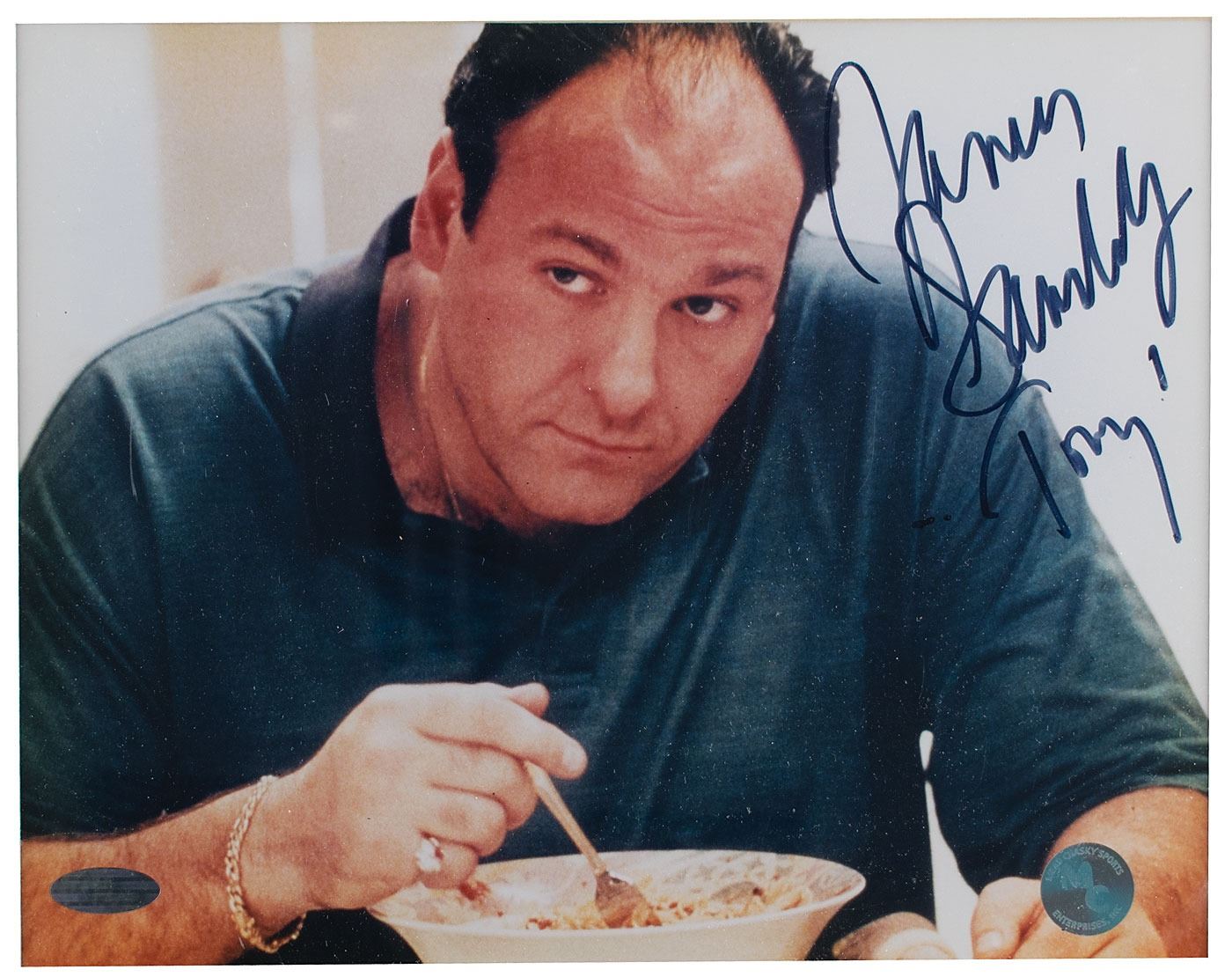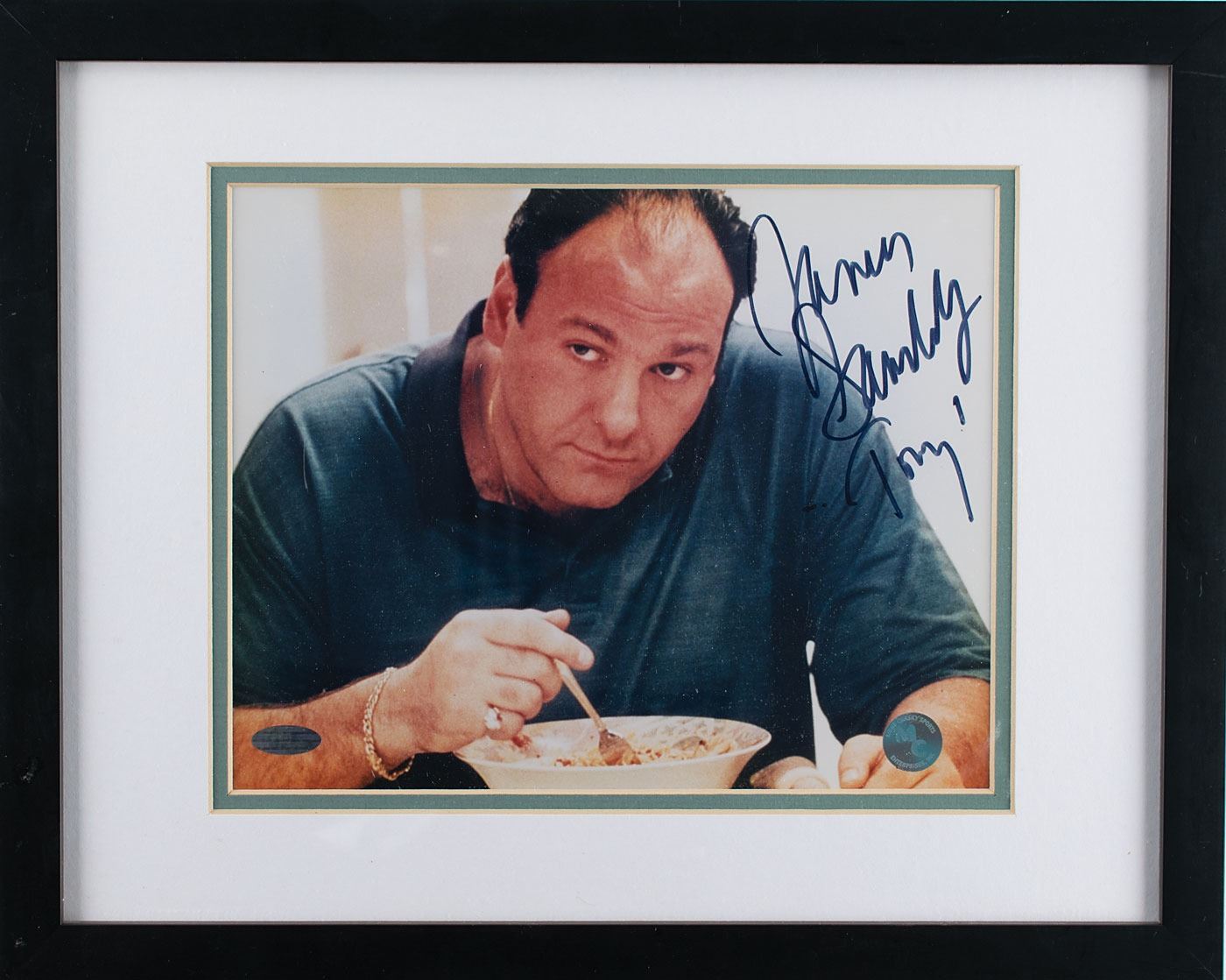 Color satin-finish 9.5 x 7.5 photo of Tony Soprano eating cereal, signed in black felt tip, "James Gandolfini, 'Tony.'" Double-matted and framed to an overall size of 15.25 x 12.25. In fine condition, with a Steiner label affixed to the lower left corner. Accompanied by a certificate of authenticity from Steiner.