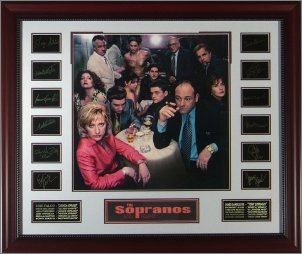 The Sopranos premiered on premium cable network HBO on January 10, 1999 and ended its original run of six seasons and 86 episodes on June 10, 2007. Set in New Jersey, where it also was produced, the series revolves around mobster Tony Soprano (James Gandolfini) and the difficulties he faces as he tries to balance the often conflicting requirements of his home life and the criminal organization he heads. This is the Sopranos custom framed unautographed Signature Engraved oversize 36x31 piece featuring the Engraved Replica Signatures of cast members-Tony Soprano - James Gandolfini, Carmela Soprano - Edie Falco, Meadow Soprano - Jamie-Lynn Discala, A.J. Soprano - Robert Iler, Dr. Melfi - Lorraine Bracco, Michael Imperioli - Christopher Moltisanti, Silvio Dante - Stevie Van Zandt, Paulie Walnuts Gualtieri - Tony Sirico, Junior Soprano - Dominic Chianese, Adriana LaCerva - Drea de Matteo, Ralph Cifaretto - Joe Pantoliano, Janice Soprano - Aida Turturro.