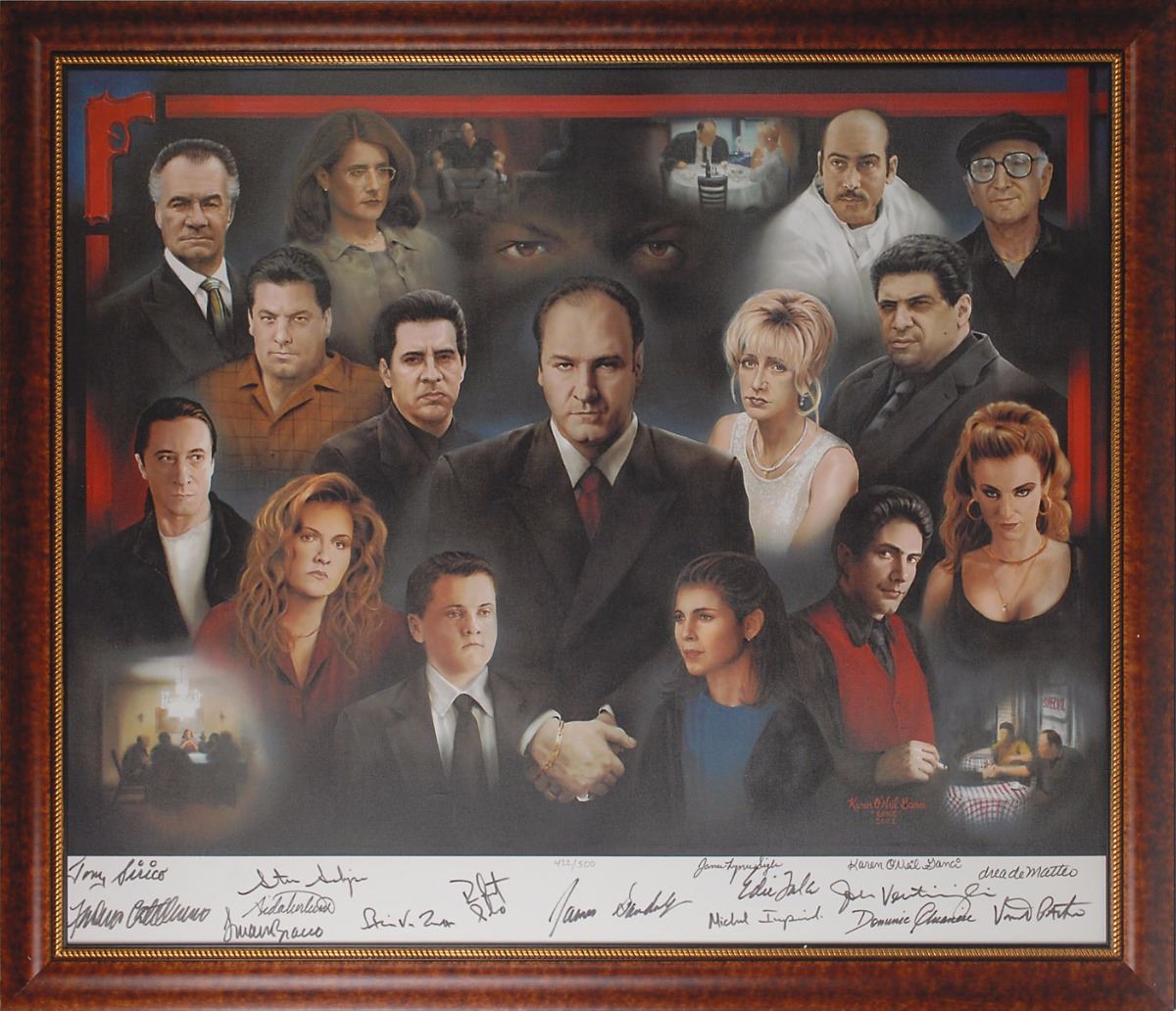 Color limited edition 35 x 29.5 canvas print, numbered 422/500, signed in the lower border in black felt tip by all 15 pictured cast members: James Gandolfini, Tony Sirico, Steve Van Zandt, Robert Iler, Vincent Pastore, Michael Imperioli, Dominic Chianese, Lorraine Bracco, Edie Falco, John Ventimiglia, Drea de Matteo, Jamie-Lynn Sigler, Federico Castelluccio, Aida Turturro, and Steve Schirripa. Also signed in black felt tip by the artist, Karen O’Neil Ganci. Framed to an overall size of 40 x 34. In fine condition. This print was the only officially commissioned signing done by the cast of the show. Oversized.
