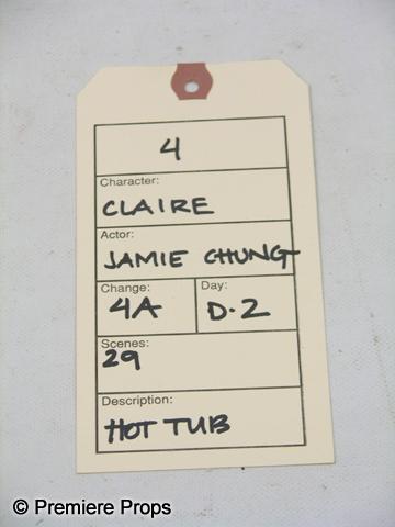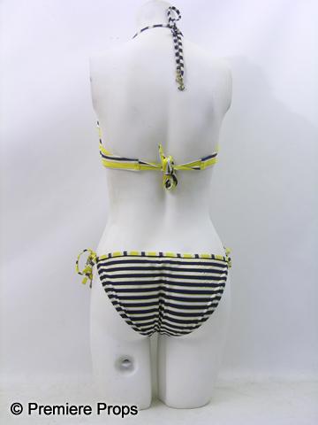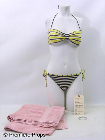 Sorority Row - Sisters for life...and death. Direct from the set of the new thriller, Sorority Row, this is Claire's (Jamie Chung) screen worn navy white and gold tie up with anchors on ties two piece swimsuit, pink towel, and faux silver and gold metal clasp bracelet. Includes wardrobe tag! (SRR1025)