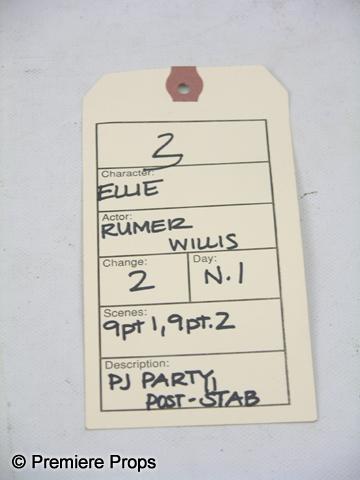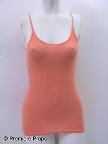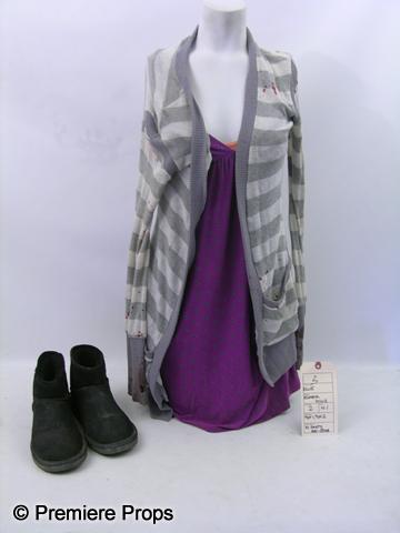 Sorority Row - The Sisters of Theta Pi Are Dying To Keep a Secret. From the set, this is Ellie's (Rumer Willis) screen worn, orange ribbed sleeveless spaghetti strap "Michael Stars" tank top, (size One size fits most) pink with gray flowers sleeveless "Gilligan & O'Malley" sleepwear, (size S) bloody gray and white stripped long sleeve open in the front sweater, and dirty black leather with rubber soles "Bear paw" boots. (size 8) This costume includes a costume department wardrobe tag! (SRR1014)