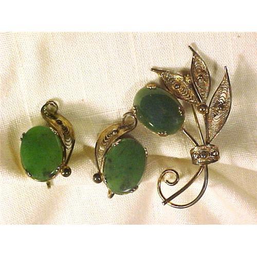 Lovely Sorrento Vermeil Sterling Silver (gilted sterling) pin and earrings set. The stones are large Jade cabochons. <p> The Jade cabs in the earings are 1/2" x 5/8". In the pin the stone is about the same but is thicker and a darker shade. <p> There is a wee bit of patina to both pieces. They can be polished up if you so desire. <p> Please excuse the poor picture quality.