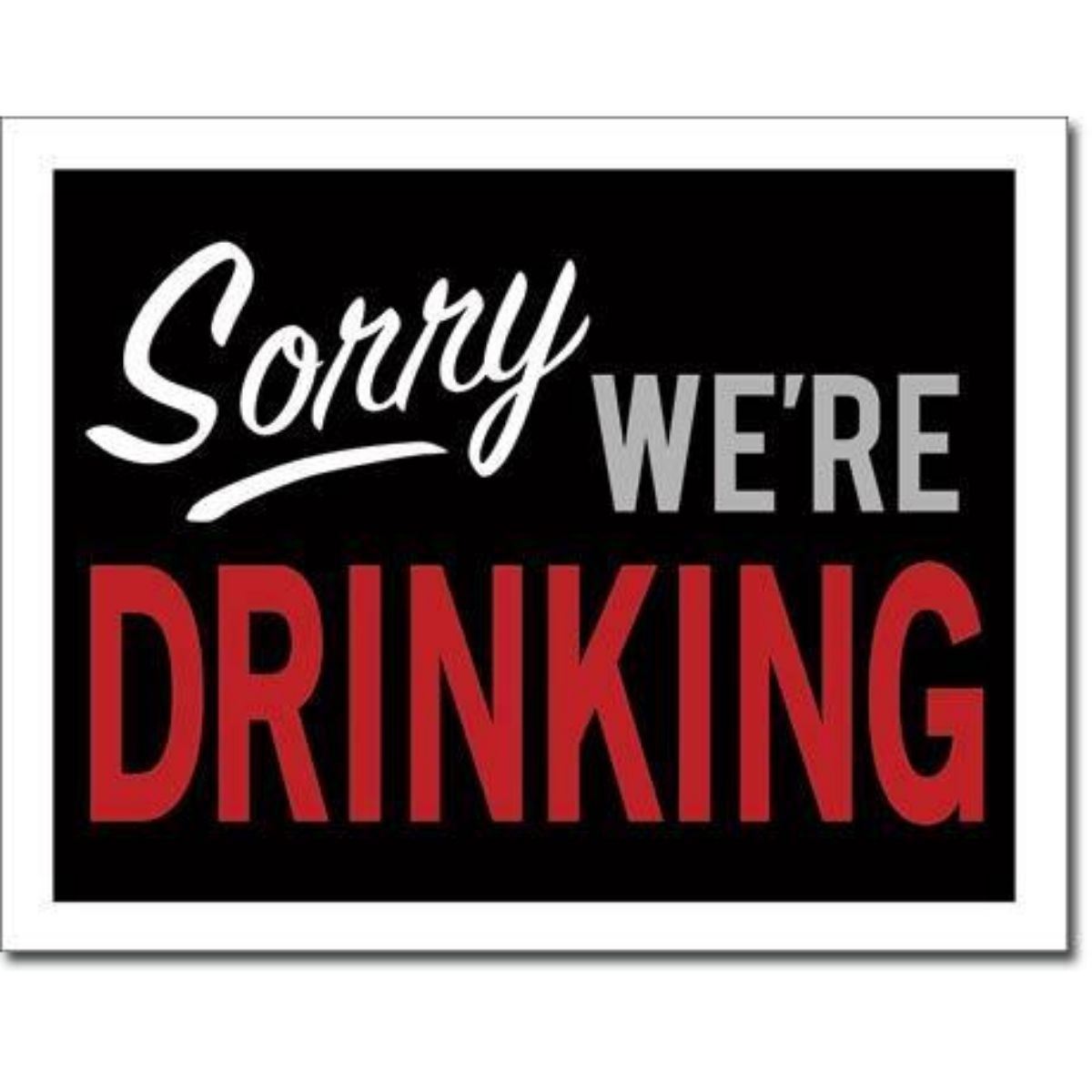"Sorry We're Drinking" metal pub bar sign. 12 1/2" X 16" with pre-drilled holes for mounting.Â