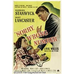 <B>Sorry, Wrong Number (Paramount, 1948)</B></I> One Sheet (27" X 41"). Barbara Stanwyck portrays a wealthy invalid who inadvertently listens in on a conversation via a telephone party line. The subject? The two men are plotting a murder! Excitement builds as she tries to find out, not only who's planning the murder, but who the two men want to murder. This was film noir meets horror at it's best. The one sheet is very clean with the most minimal touch up to a couple of places on the fold lines and at the center points. The most noticeable defect is repair to a two inch tear in the yellow background in the upper left corner. Very Fine.