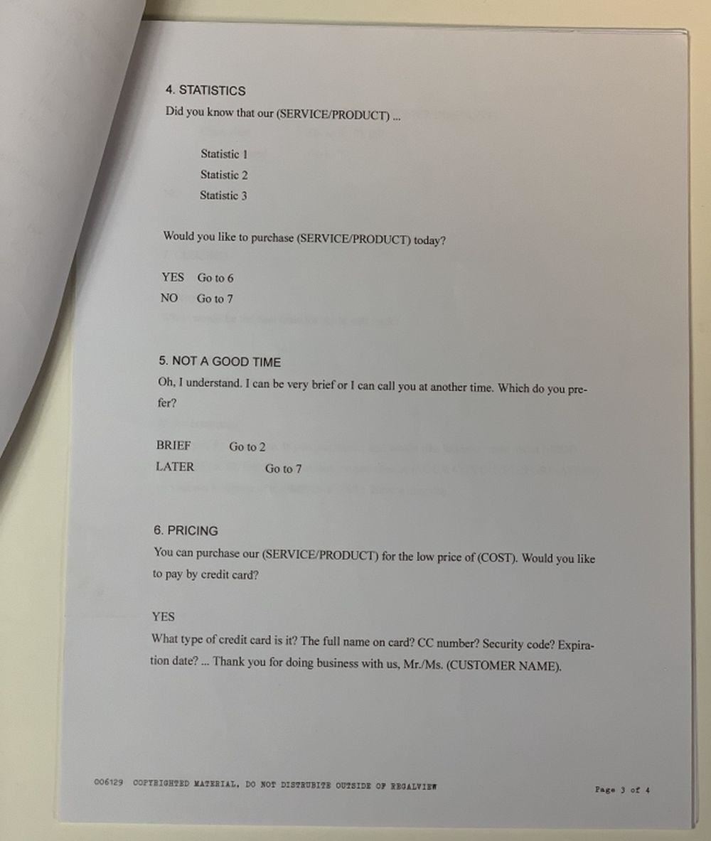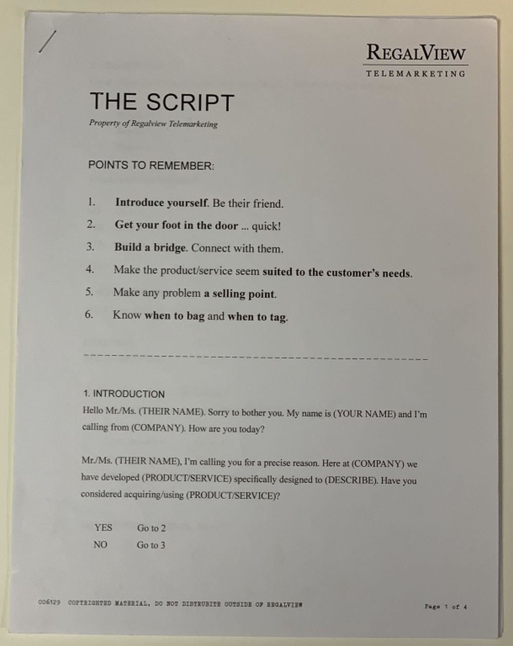 Original telemarketing script used in the science-fiction dark comedy film "Sorry to Bother You" (2018), where, in an alternate present-day version of Oakland, telemarketer Cassius Green discovers a magical key to professional success, propelling him into a universe of greed.