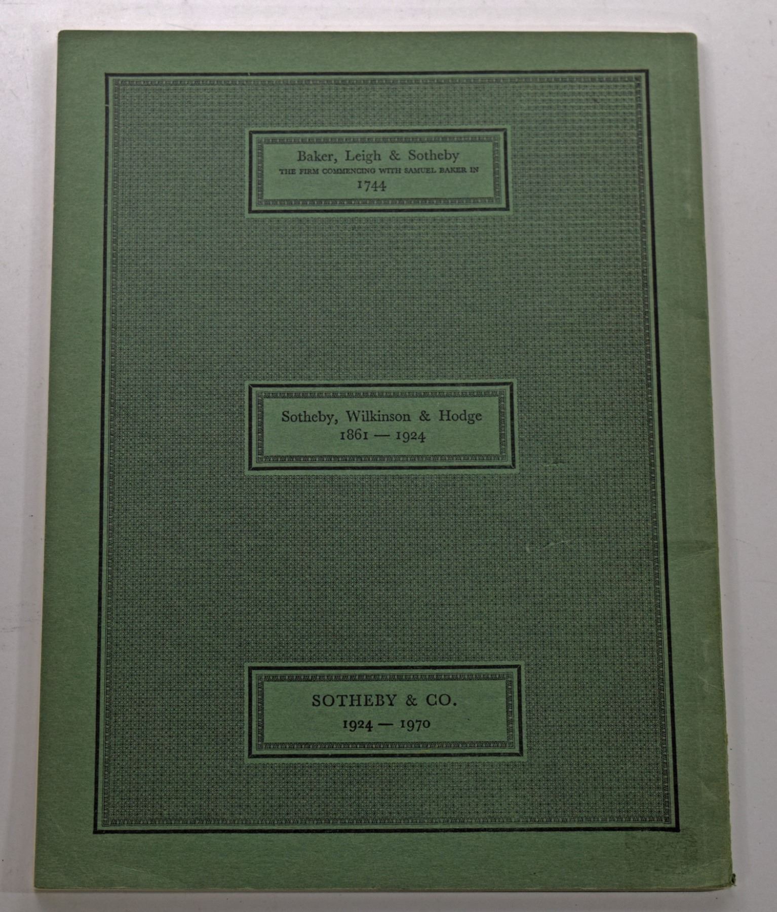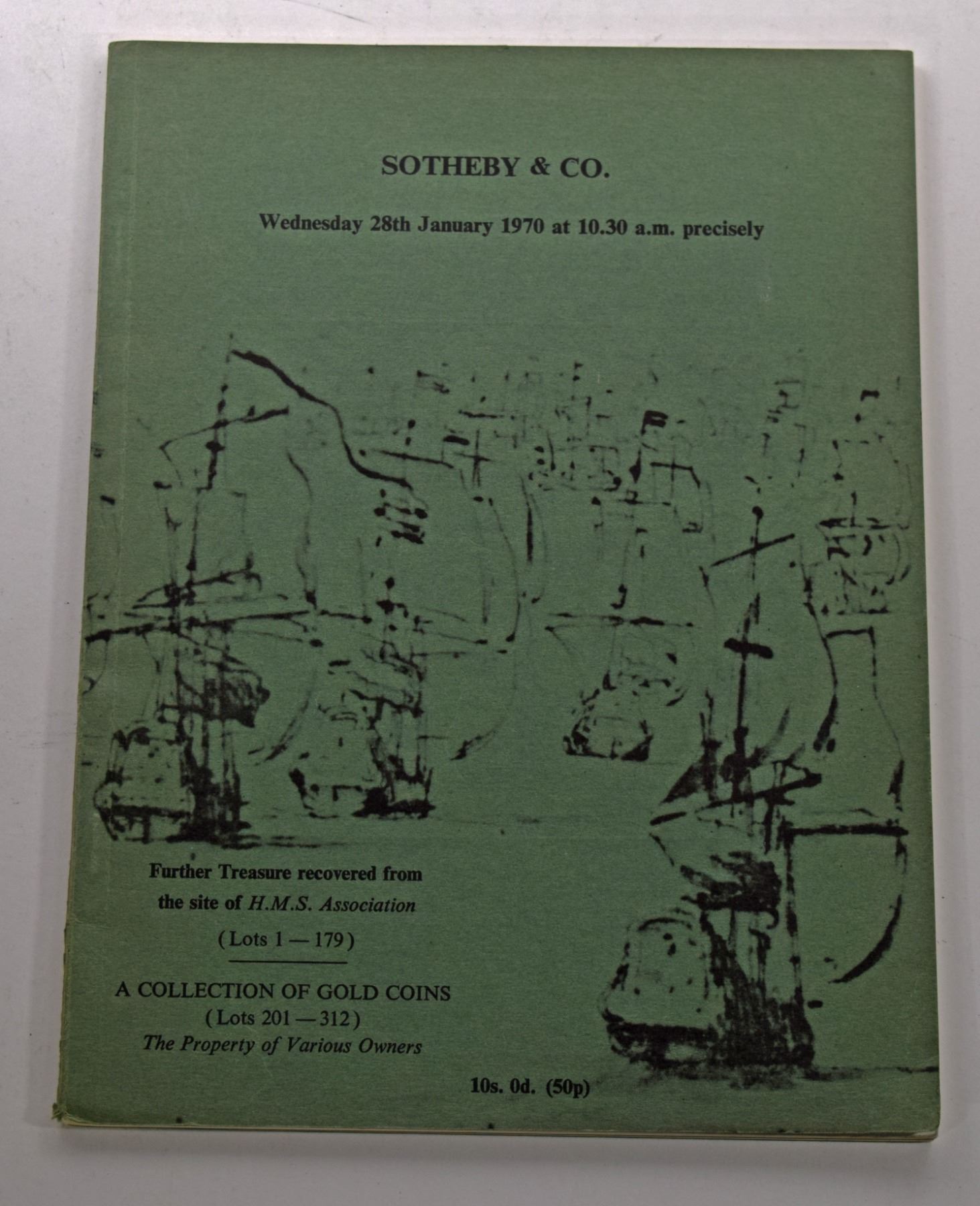 Sotheby & Co. FURTHER TREASURE RECOVERED FROM THE SITE OF H.M.S. ASSOCIATION. January 28, 1970. 8vo, 38 pages; Softcover; This auction catalog includes 89 lots of gold coins (guineas, half guineas, and reis), 80 lots of silver coins (cobs, crowns and half crowns), 10 lots of artifacts, and one lot of gold chain pieces…all salvaged from “HMS Association,” which sank in 1707 off the Isles of Scilly, England. Subject: History - Sunken Treasure