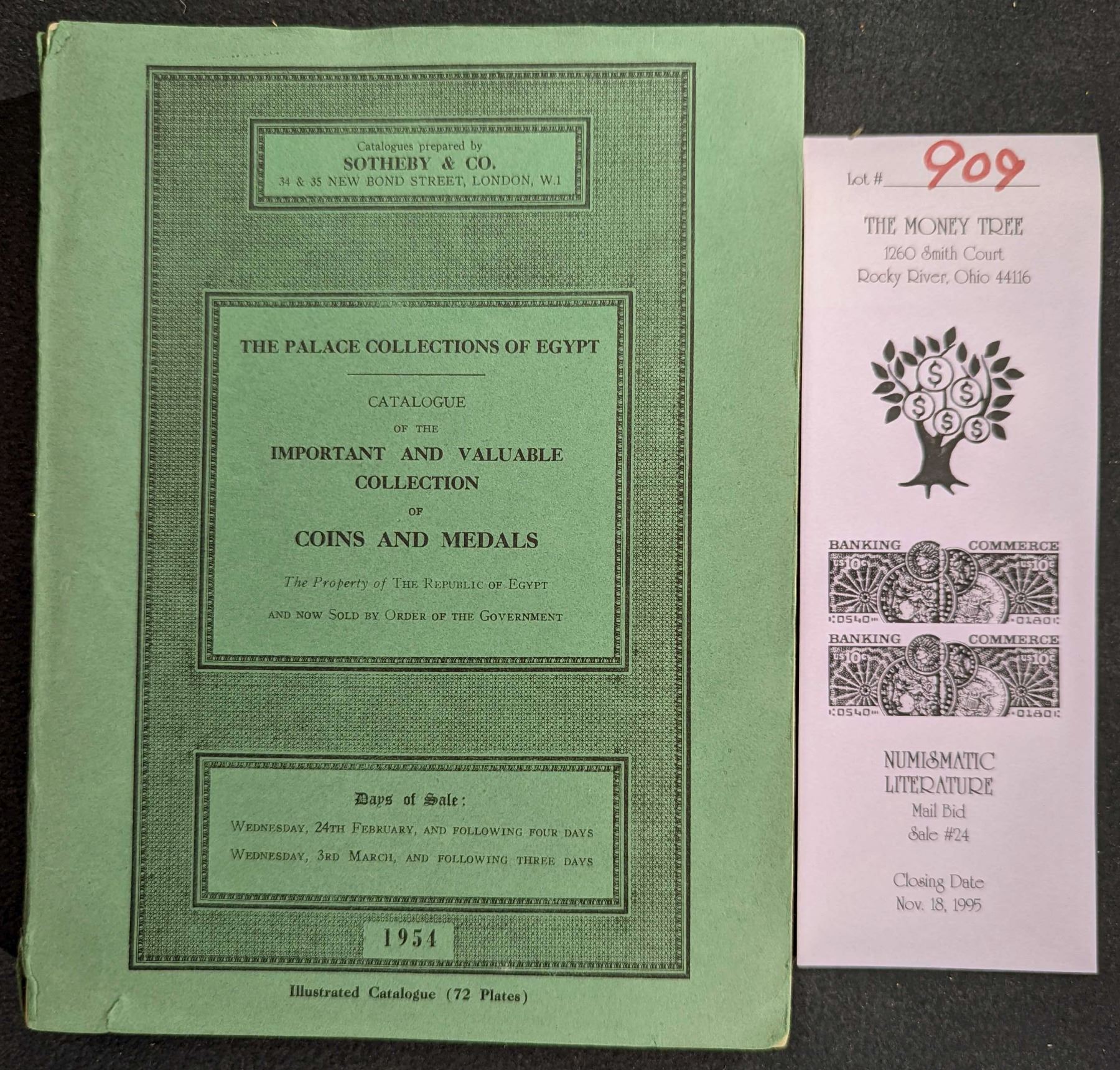 Sotheby & Co. THE PALACE COLLECTIONS OF EGYPT. CATALOGUE OF THE HIGHLY IMPORTANT AND EXTREMELY VALUABLE COLLECTION OF COINS AND MEDALS. THE PROPERTY OF THE REPUBLIC OF EGYPT AND NOW SOLD BY ORDER OF THE GOVERNMENT. February 24-March 6, 1954. 1-2798 lots. 4to. This auction sale catalog includes numismatic material from the collection that was formed by King Farouk of Egypt, who sought coins with a passion-some may even say with an obsession-matched by few collectors in history. His collecting pursuits may have even contributed to his exile from Egypt and the throne. This exile was followed by the sale of his collection by the Egyptian government. The sale abounded with catalogue errors and misjudgments. Probably the most famous was the cataloguing of an 1804 Dollar as though it was a common coin, with no reference to it's value as a great American rarity. This and other such practices, as well as the bid rules established by Egypt make this an extremely interesting catalogue for study. Pittman, Kosoff, Hans Schulman and a handful of other East Coast coin dealers made fantastic buys at this sale by buying many rarities hidden among group lots, such as a 1913 Liberty Head nickel and pattern United States gold coins. Cairo. original printed card covers. Crown 4to. 306, (6) pages. 37 plates. near Fine. PRL. ex Money Tree Sale No. 24 lot 909. Clain-Stefanelli 8013*. Grierson 275 and 277. Lot weight: 2 lbs 0oz. Subject(s): Ancient, United States, Latin America, Europe, World Coinage and Medals.