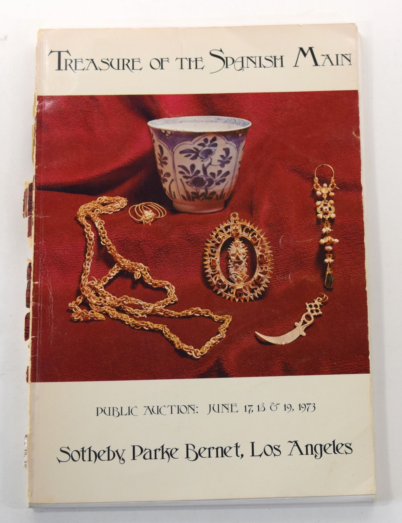 Sotheby Parke Bernet Los Angeles. TREASURE OF THE SPANISH MAIN. June 17-19, 1973. 8vo, 135 pages; Softcover; Covers and pages have separated from the binding but contents are complete. This occurrence is notorious for this particular catalog and because of this it is a very rare issue. Would be an excellent candidate for hardbinding; This auction catalog contains 609 lots of gold and silver cobs, 1 cannon and 57 lots of ingots, jewelry, and artifacts from the 1715 Fleet wrecks. A large number of black and white plates illustrate about half of the items. The catalog includes a summary of the wrecks, a map, and a discussion of the coins (and their shields). Subject: History - Sunken Treasure