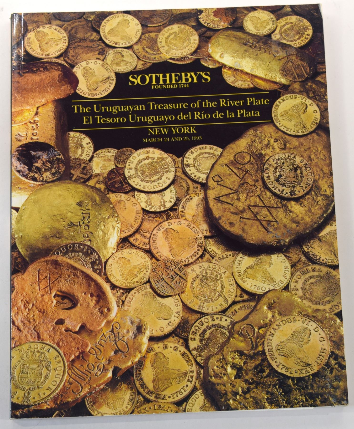 Sotheby's New York. THE URUGUAYAN TREASURE OF THE RIVER PLATE. March 24-25, 1993. 4to; Softcover; This auction catalog contains 725 gold cob and portrait coins, 37 gold ingots, 10 lots of silver cobs, 3 lots of artifacts, and a gold jewelry box from the “Nuestra Senora de la Luz,” which sank in 1752 in the River Plate, Uruguay. A history of the shipwreck and salvage is included. Subject: History - Sunken Treasure