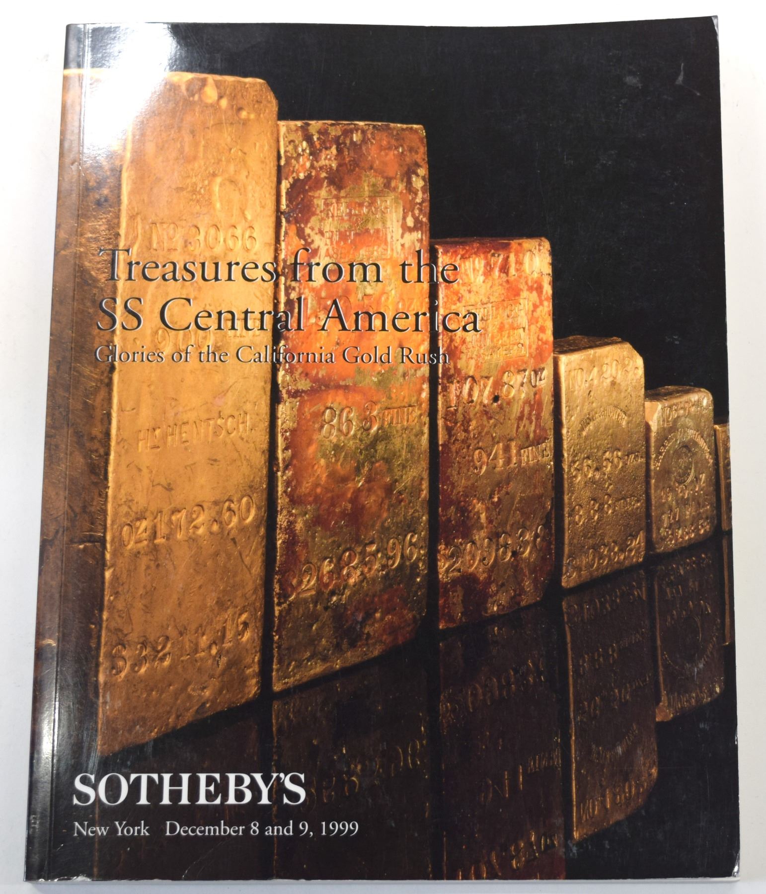 Sotheby's New York. TREASURES FROM THE SS CENTRAL AMERICA - GLORIES OF THE CALIFORNIA GOLD RUSH. December 8-9, 1999. 4to, 205 pages; Softcover; PRL; This auction catalog contains 250 lots of spectacular Gold Rush era gold coins (mostly double eagles), gold bars (many from rare private California mints), and nuggets salvaged from the steamer, “SS Central America,” which sank off the coast of North Carolina in 1857. The history of many of the private mints is also provided, along with vivid color photographs. Subject: History - Sunken Treasure