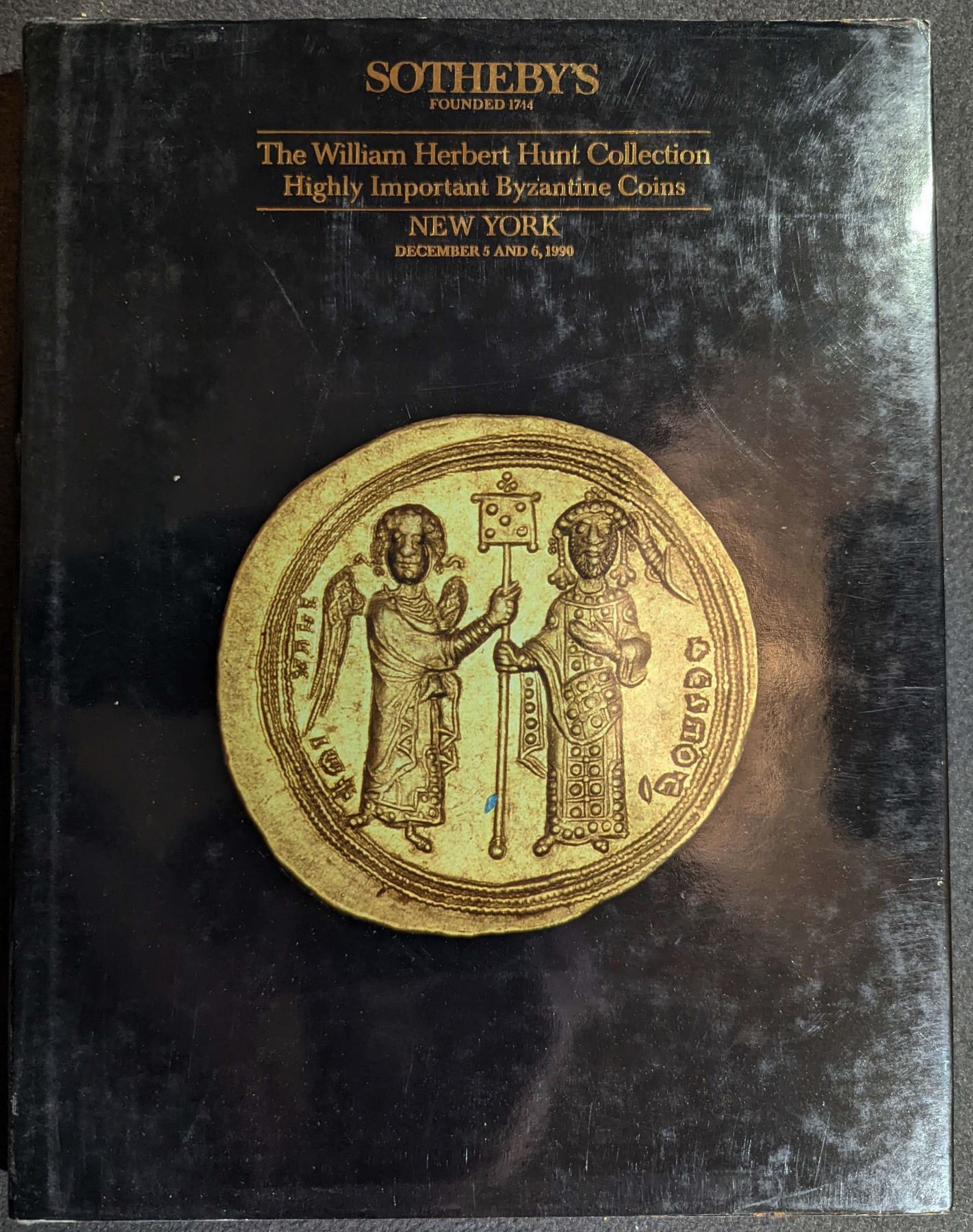 Sotheby's - New York. THE WILLIAM HERBERT HUNT COLLECTION. HIGHLY IMPORTANT BYZANTINE COINS. PART I. December 5-6, 1990. 1-962 lots. 4to. This auction sale catalog includes numismatic material from the Byzantine Empire as part of the collection put together by William Herbert Hunt. The sale includes lots covering the period from Constantine the Great to Anastasius I, Justin I, Justinian I, Justin II and Tiberius II Constantine, Anastasius II, Artavasdus, Irene, Michael I with Theofylactus, Michael II, Michael III with Theodora and Thecla, Basil I, Basil I with Constantine and Eudocia, Leo VI, Alexander, Constantine VII and Zoe, Basil II and Constantine VIII, Romanus III, Michael IV, Zoe and Theodora. The later periods of the Empire are similarly well covered. The collection is equally rich in bronze coinage both common and rare, and there are splendid runs of the more familiar solidi, generally in a superb state of preservation. New York. Original gray cloth, gilt; dust jacket. b&w plated. Fine. Lot weight: 2 lbs 3oz. Subject(s): Ancient Coinage.