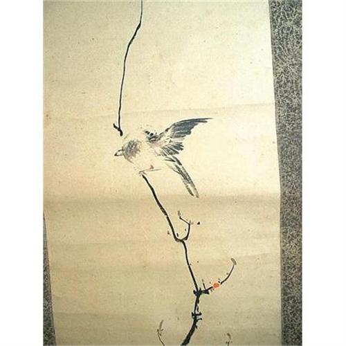 Just like the hawk is renowned for his focus, Sotosei wisely keeps this painting simple to keep your focus on the spare rendering of Japan's auspicious tree and the bird that the Japanese consider to be the most elegant and dignified. A beautifully and heart-warmingly performed piece. Mount: 73 x 16 inches, 185.5 x 41 cm. Painting: 52 x 12 inches, 132 x 30 cm