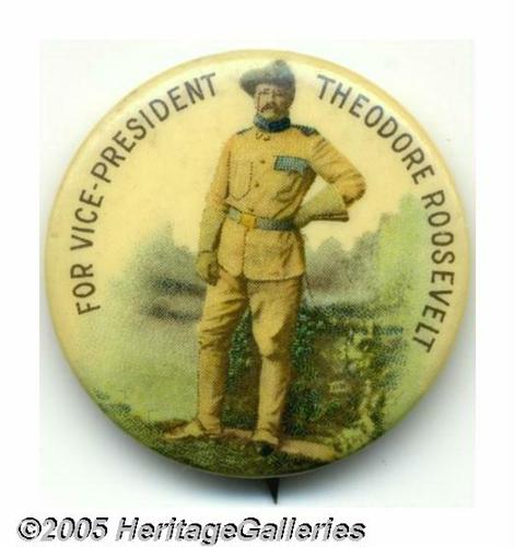 <B>Sought-after 1 1/4" 1900 Teddy Roosevelt for Vice President Button</B></I> A very choice example of this popular rarity. Designs showing Teddy in Rough Rider uniform always command a premium, and here that factor is multiplied by the rich color, condition, and the desirable "for Vice President" slogan, rather than the usual "for President" varieties. Distinctive National Equipment Co. backpaper is in near-mint condition as well. Lot:260