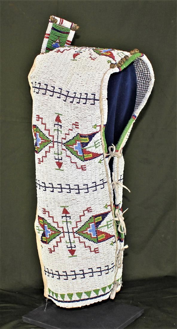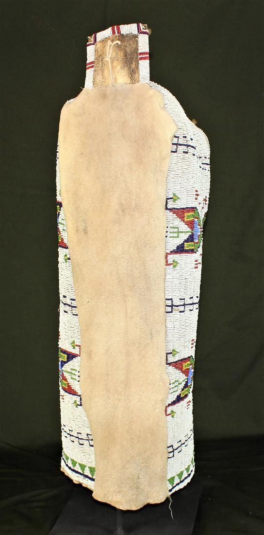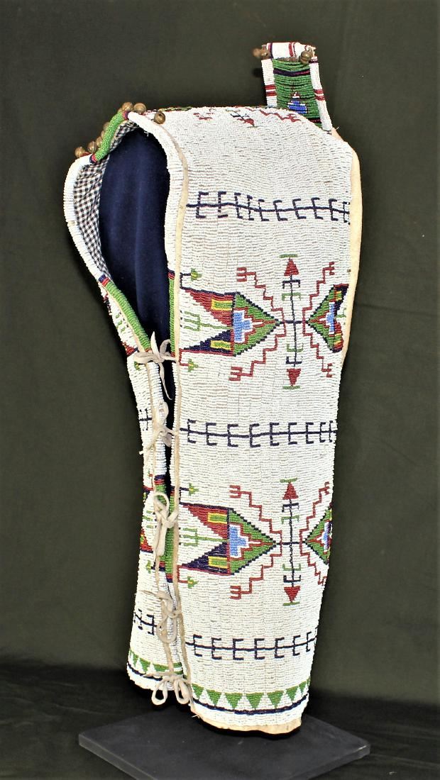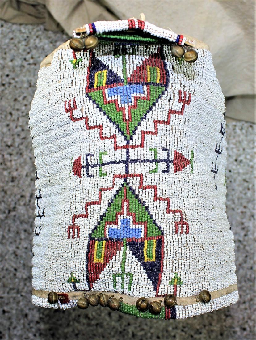 Spetacular 19th Century cradle cover, fully beaded in dazzling geometric design with early beads consisting of red white hearts, cobalt blues, and apple greens, on a white background. All finely crafted with fringe and brass hawk bells on native tanned hide. Measuring 27"x 9"x 9".