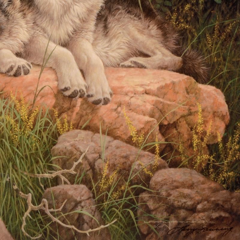 "Soul Mates - Gray Wolves" is a limited edition lithograph on paper by Larry Fanning (1938-2014), numbered and hand signed with a Letter of Authenticity. Measures approximately 23" x 18.5" (image).