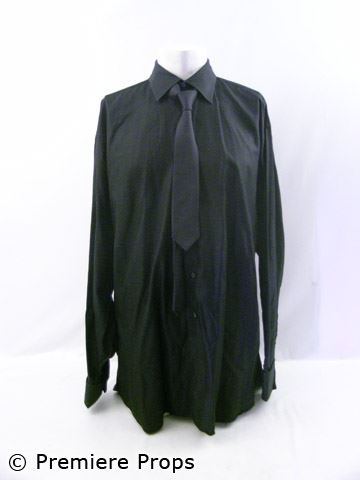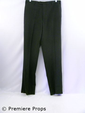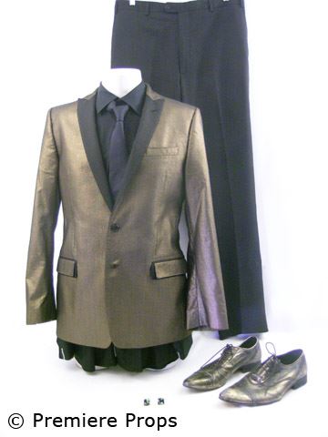 Floyd's (Bernie Mac) screen worn, hero, dark gold cotton/poly "Dolce & Gabbana" l/s 2 button suit jacket (size 54), black wool w/ tuxedo stripe "Zanella" slacks (size 38), black w/ self stripe "Ike Behar" l/s button up shirt (made to order), black silk "Prada" skinny neck tie, black w/ gold detail suspenders, black pleated silk w/ silver buckles cummerbund, black/green/gold glass squares on gold studs cufflinks, gold brushed leather "Aldo" lace up shoes (size 42)